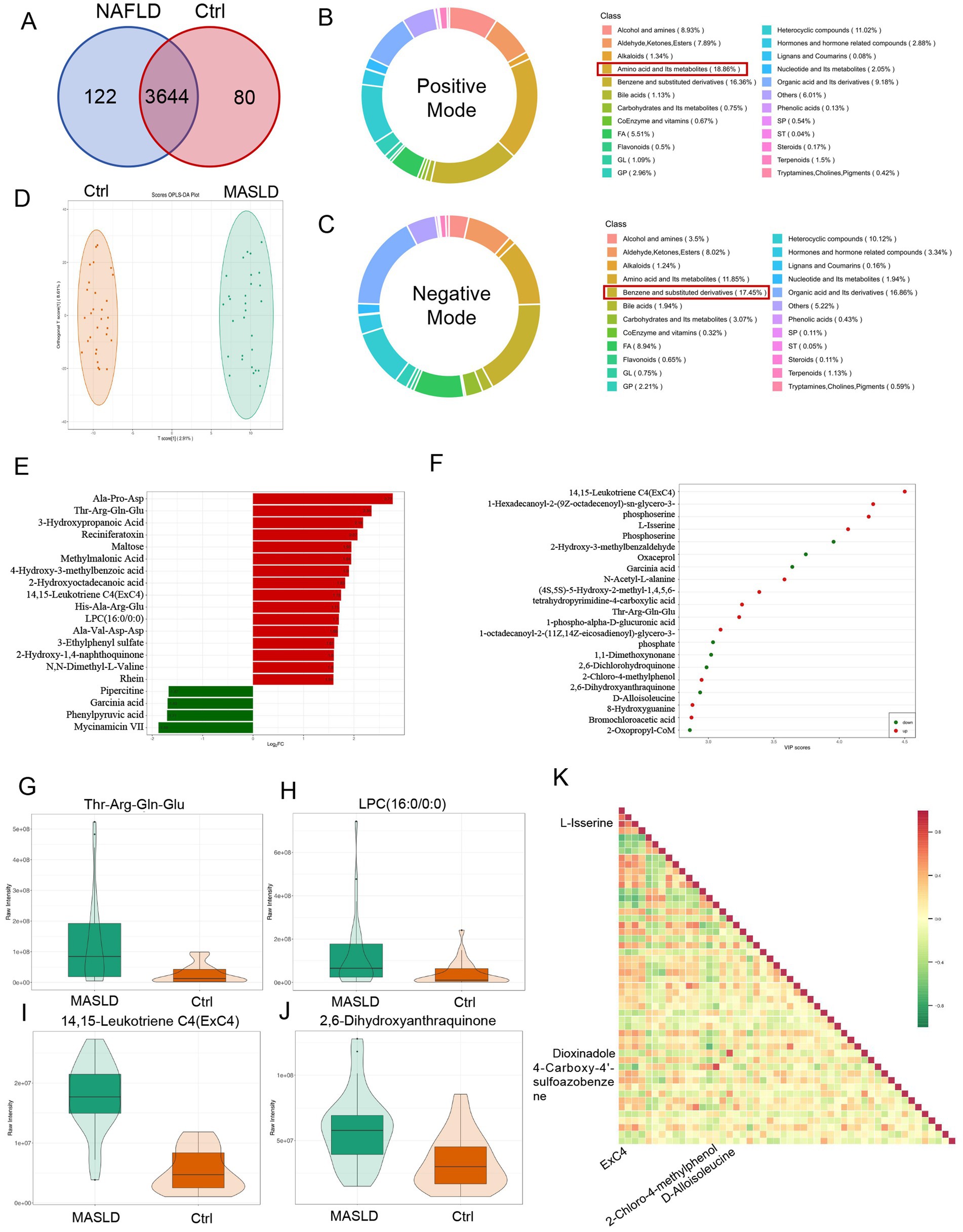Figure 4. Differential metabolite maps of untargeted metabolomics in MASLD. (A) Venn diagram of differential metabolites between the MASLD and Ctrl groups; (B) Distribution proportion of metabolite types detected in positive mode; (C) Distribution proportion of metabolite types detected in negative mode; (D) OPLS-DA-based PCA analysis of the MASLD and Ctrl groups; (E) Bar chart of FCchanges in differential metabolites between the MASLD and Ctrl groups; (F) Dot plot of VIP score for differential metabolites between the MASLD and Ctrl groups; (G–J) Violin plots of differential metabolites including Thr-Arg-Gln-Glu, 14,15-Leukotriene C4 (ExC4), LPC (16:0/0:0), and 2,6-Dihydroxyanthraquinone; (K) Heatmap of correlation analysis of differential metabolites.