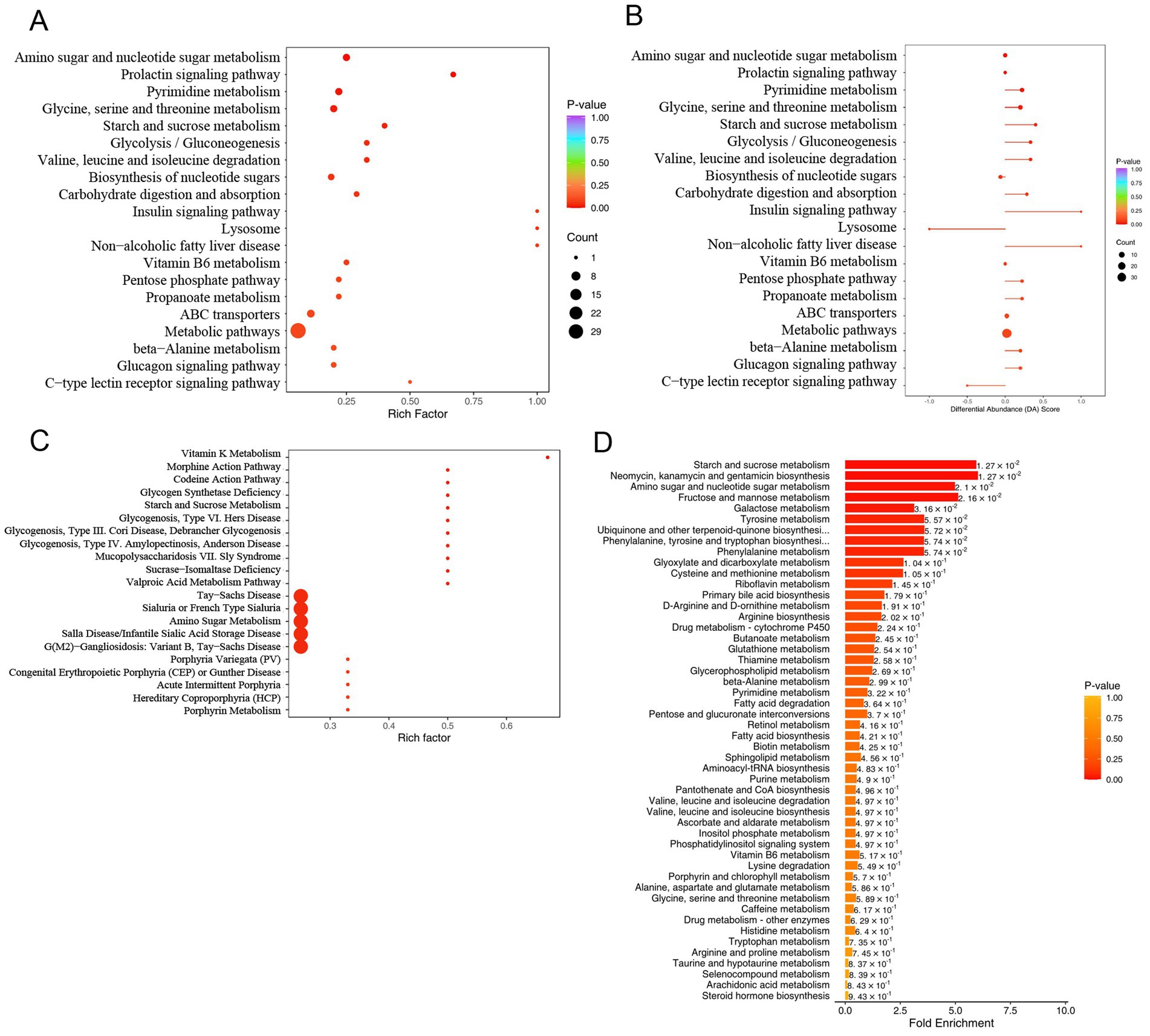 Figure 5. Pathway enrichment analysis of differential metabolites in untargeted metabolomics: (A) Dot plot of KEGG enrichment analysis for upregulated metabolites in MASLD; (B) Differential abundance scores of upregulated metabolites in MASLD; (C) Dot plot of HMDB functional annotation and enrichment analysis for upregulated metabolites in MASLD; (D) Bar chart of MSEA enrichment analysis for upregulated metabolites in MASLD.