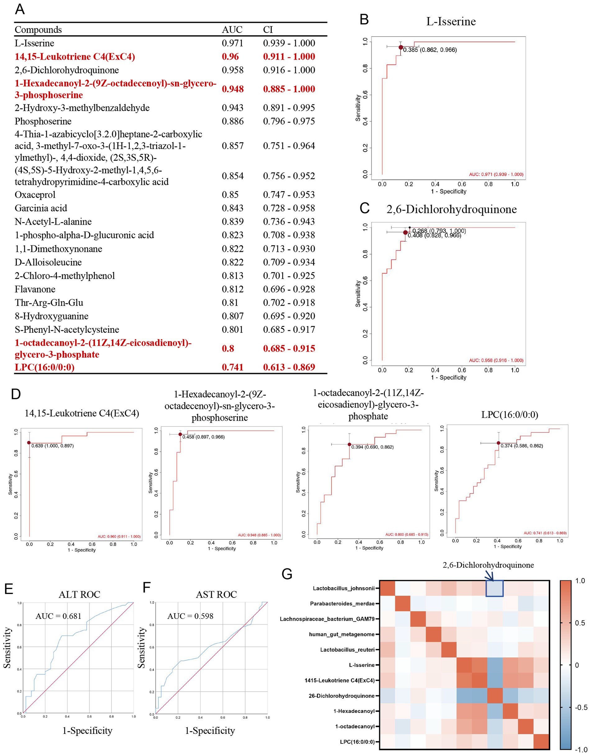 Figure 6. Diagnostic efficacy of upregulated glycerophospholipid metabolites in MASLD. (A) Table of AUC and CI for upregulated metabolites in MASLD; (B) ROC curve for L-Isserine; (C) ROC curve for 2,6-Dichlorohydroquinone; (D) ROC curves for glycerophospholipid metabolites 14,15-Leukotriene C4(ExC4), 1-Hexadecanoyl-2-(9Z-octadecenoyl)-sn-glycero-3-phosphoserine, 1-octadecanoyl-2-(11Z,14Z-eicosadienoyl)-glycerol-3-phosphate, and LPC (16:0/0:0); (E) ROC curve for ALT; (F) ROC curve for AST; (G) Correlation map between gut microbiota and metabolites.