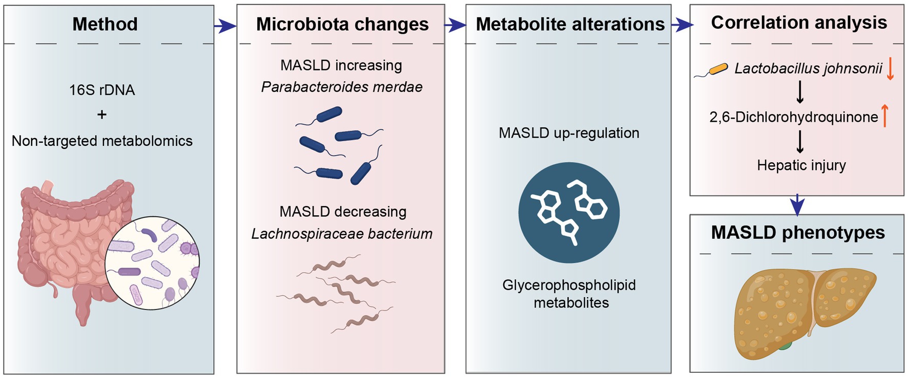 Discussion: After analysis of gut microbiota and metabolites, we found that Lactobacillus johnsonii down-regulated in MASLD drives 2,6-Dichlorohydroquinone accumulation, provoking toxic buildup and accelerating disease progression.