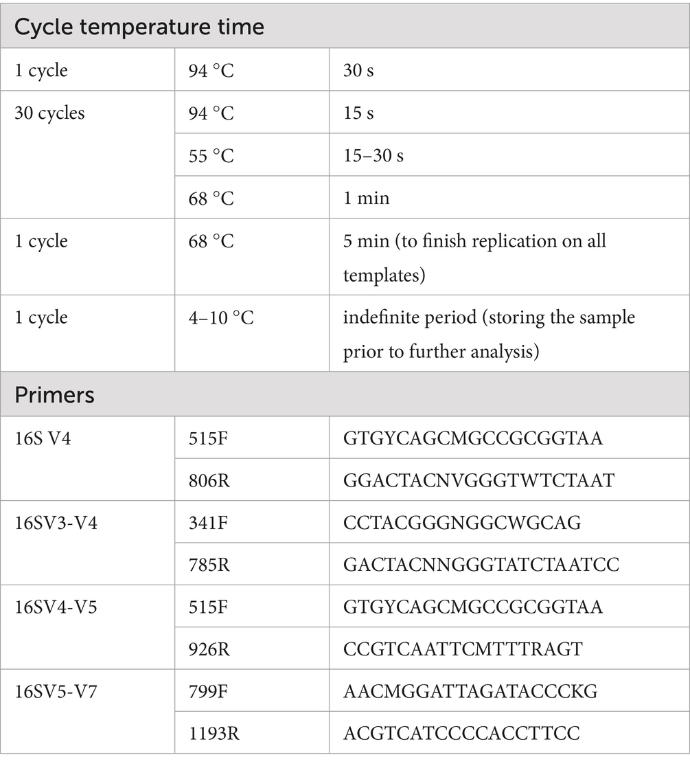 Bacterial DNA was extracted from human stool samples using a TIANamp Stool DNA Kit (TIANGEN, Beijing, China). The purity and concentration of the DNA were then assessed by agarose gel electrophoresis. PCR was performed using barcoded primers and a high-fidelity enzyme (Phusion® High-Fidelity PCR Master Mix with GC Buffer, Biolabs, New England). The PCR protocol and primers were in Table 1. The PCR products were detected by 2%agarose gel electrophoresis. Qualified PCR products were purified with magnetic beads and then subjected to agarose gel electrophoresis again for target band recovery. Subsequently, the library was constructed using the TruSeq® DNA PCR-Free Sample Preparation Kit. The constructed library was quantified by Qubit and qPCR. After the library passed the quality check, sequencing was carried out on the NovaSeq 6,000 platform.