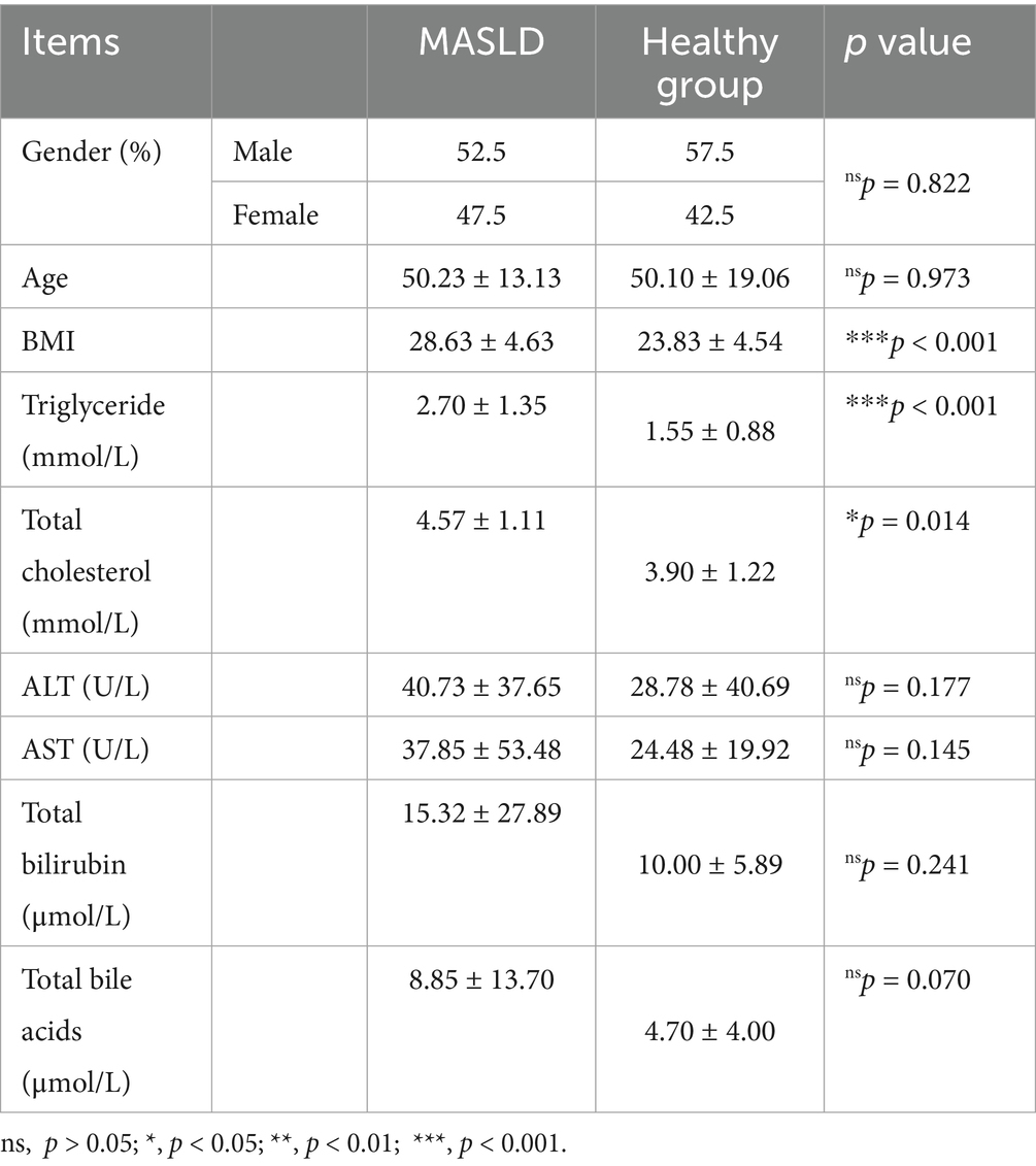Samples included 40 MASLD patients and 40 healthy controls (Ctrl). All patients were diagnosed through ultrasound examination and excluded individuals with NASH and other metabolic syndromes. MASLD patients and healthy controls were recruited from the First People’s Hospital of Kashgar Prefecture in 2023–2024.