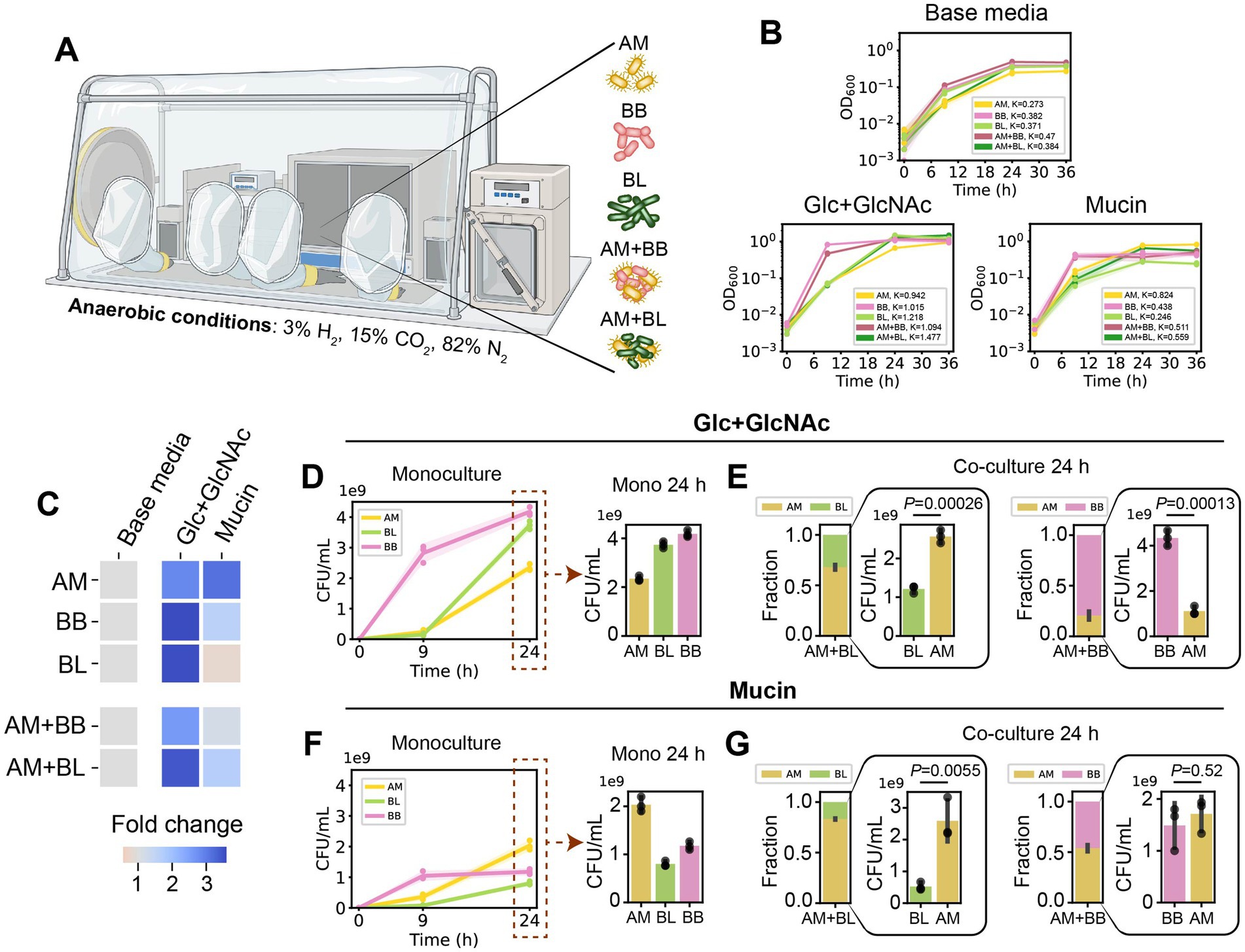 Illustration of an anaerobic chamber setup and various data plots. The chamber includes compartments labeled for AM, BB, BL, AM+BB, and AM+BL. Graph B shows optical density over time for different media: Base, Glc+GlcNAc, and Mucin. Panel C presents a heatmap indicating fold change for various bacterial combinations across media types. Graphs D and F depict monoculture growth over time. Graphs E and G show co-culture data with statistical significance indicated (e.g., P = 0.00026). The experiments are under anaerobic conditions with specific gas compositions.