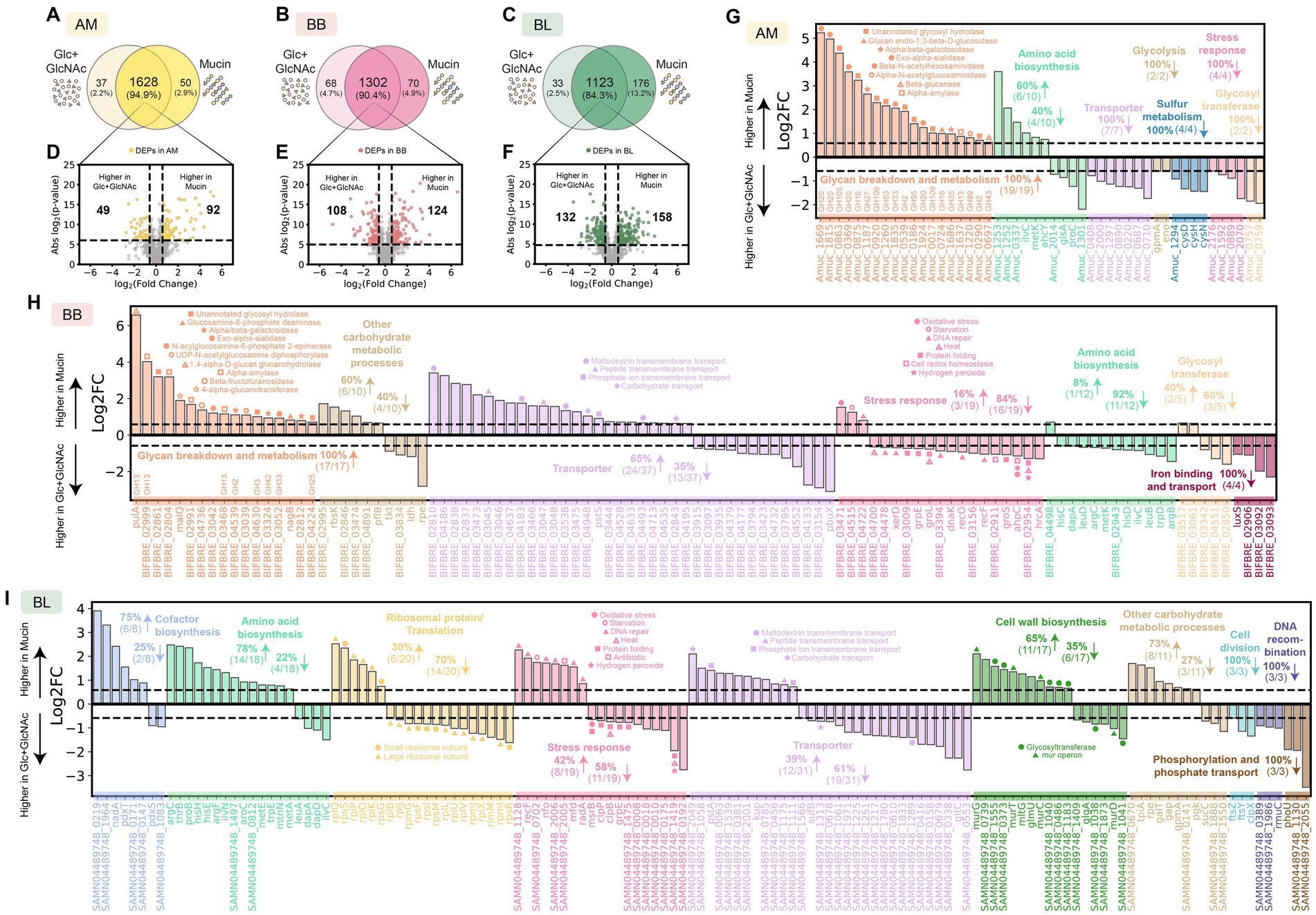 Figure 2. Proteome alterations of A. muciniphila, B. breve, and B. longum in the presence of mucin compared to glucose and GlcNAc. (A–C) Venn diagram for proteome comparison of AM (A), BB (B), and BL (C) in the presence of mucin vs. Glc + GlcNAc. Proteins shown are detected in two out of three biological replicates. (D-F) Volcano plot for AM (D), BB (E), and BL (F) in the presence of mucin vs. Glc + GlcNAc. Benjamini–Hochberg (BH) multiple testing correction was applied to the p-values from a two-sided unpaired Student t-test to control the false discovery rate (FDR) at 10%. In addition to the BH-corrected p-value constraint, differentially expressed proteins (DEPs) are defined to be those with an absolute fold change greater than 1.5, corresponding to the colored dots. The list of DEPs for AM, BB, and BL is shown in Supplementary Tables S2, S3, and S4, respectively. (G–I) Log-transformed fold changes of selected DEPs that were expressed higher in mucin (positive values) or Glc + GlcNAc (negative values). Vertical dashed lines indicate a 1.5-fold change.