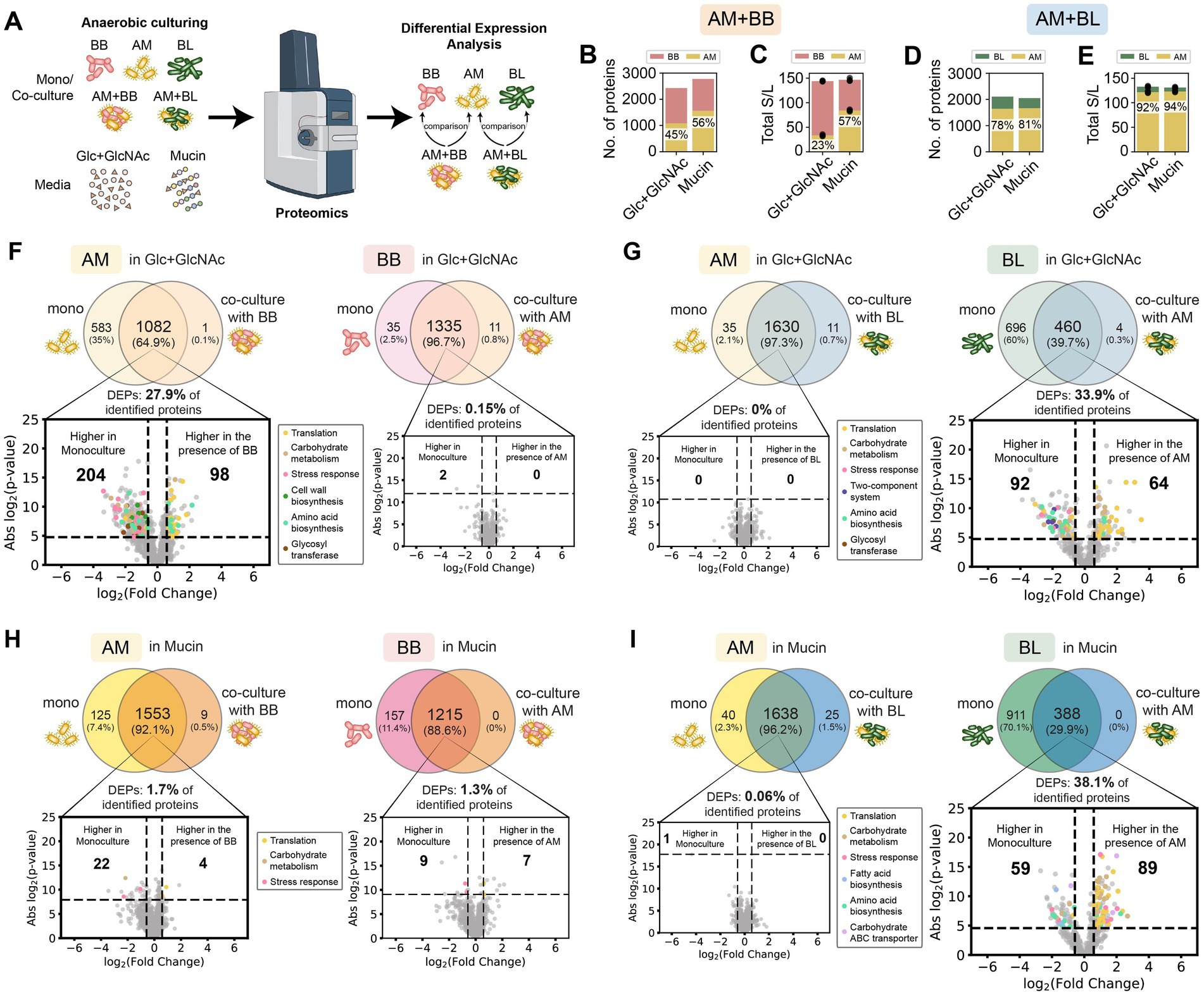 Figure 3. Proteome profiling of A. muciniphila in co-culture with B. breve or B. longum vs monoculture in the Glc + GlcNAc or mucin media. (A) Schematic of the proteomics experiment workflow. (B–E) Number of proteins (B) and total normalized spectral counts of the whole proteins (C) in the AM + BB co-culture, and the number of proteins (D) and total normalized spectral counts of the whole proteins (E) in the AM + BL co-culture in the presence of different carbon sources. The percentage shows the fraction of AM’s protein in the co-culture or the fraction of total normalized spectral counts of proteins belonging to AM in the co-culture. (F–I) Proteome comparison of AM or BB in monoculture vs. AM + BB co-culture in Glc + GlcNAc (F), AM or BL in monoculture vs. AM + BL co-culture in Glc + GlcNAc (G), AM or BB in monoculture vs. AM + BB co-culture in mucin (H), and AM or BL in monoculture vs. AM + BL co-culture in mucin (I). Proteins shown in the Venn diagrams are detected in two out of three biological replicates. The volcano plot shows proteins that are expressed higher in co-culture vs. monoculture, and proteins belonging to different biological processes are shown with different colors. Benjamini–Hochberg (BH) multiple testing correction was applied to the p-values from a two-sided unpaired Student t-test to control the false discovery rate (FDR) at 10%. In addition to the BH-corrected p-value constraint (horizontal dashed line), differentially expressed proteins (DEPs) are defined to be those with an absolute fold change greater than 1.5 (vertical dashed lines). The list of DEPs is shown in Supplementary Tables S5–S11.
