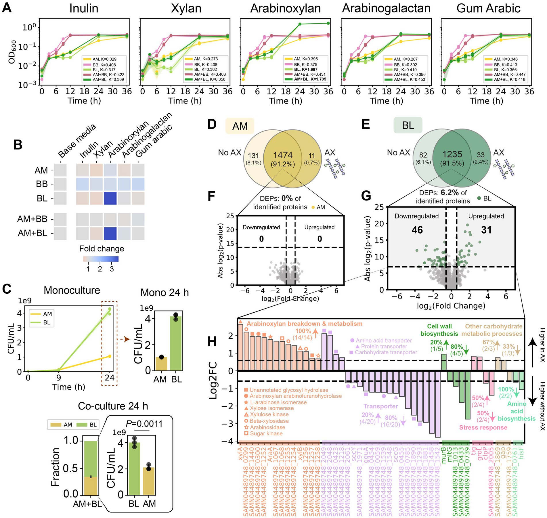 Composite scientific figure illustrating multiple experiments.A: Growth curve graphs for Inulin, Xylan, Arabinoxylan, Arabinogalactan, and Gum Arabic substrates over time, showing OD600 measurements.B: Heatmap showing fold change in various media (Base, Inulin, Xylan, Arabinoxylan, Arabinogalactan, Gum arabic) in different bacterial strains (AM, BB, BL, AM+BB, AM+BL).C: Monoculture and co-culture growth comparison of AM and BL strains, with CFU/mL measurements and statistical significance noted.D, E: Venn diagrams indicating protein identification overlaps in AM and BL with Arabinoxylan (AX), highlighting unique and common proteins.F, G: Volcano plots showing differentially expressed proteins (DEPs) in AM and BL, with emphasis on upregulated and downregulated proteins in BL.H: Bar graph detailing activities involved in Arabinoxylan breakdown and other metabolic processes, categorized by functionality like metabolism, biosynthesis, and stress response, with specifics on transporters and enzymes.Color coding matches various conditions and results throughout the figure.