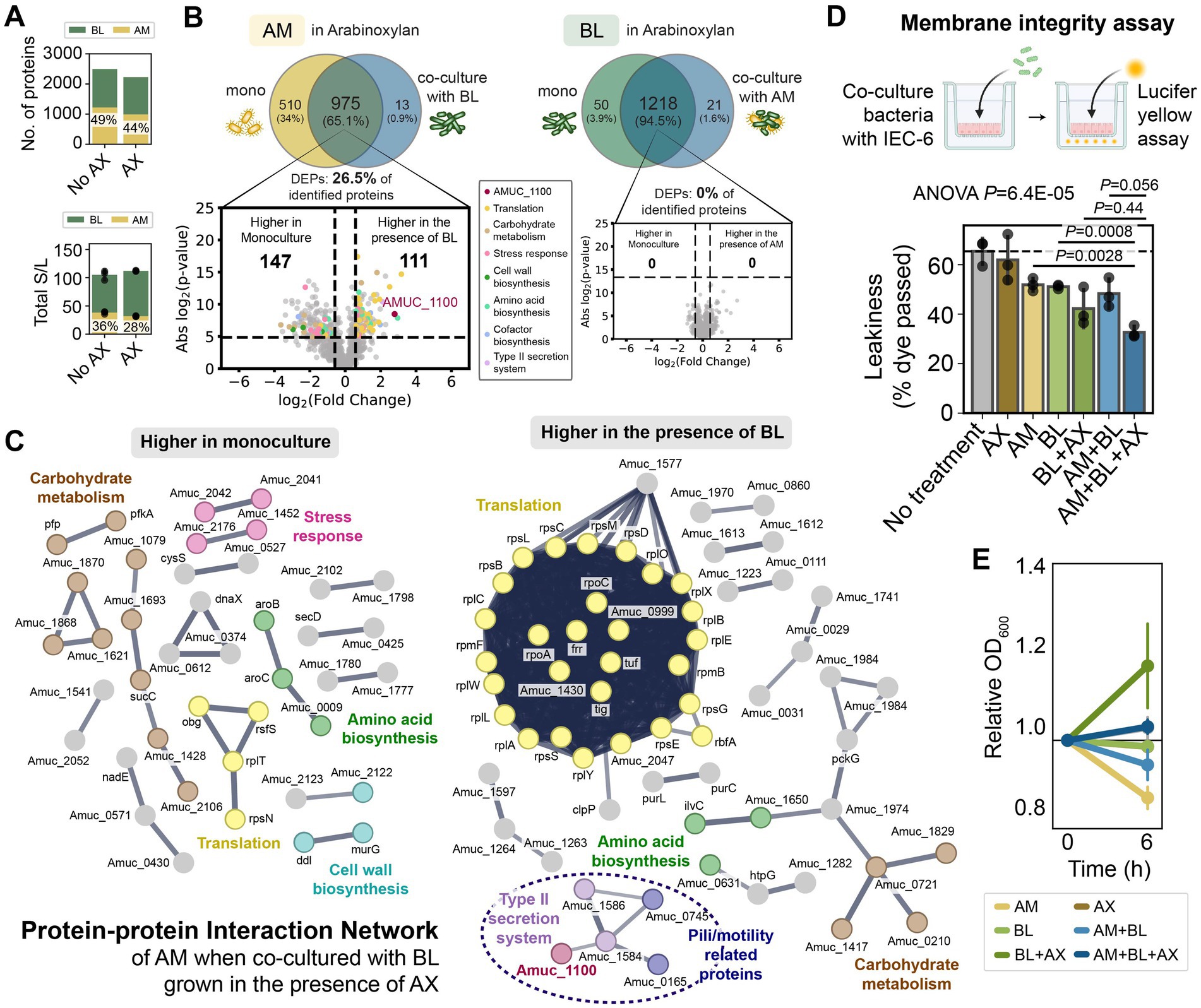Figure 5. Bifidobacterium longum causes massive alterations in A. muciniphila protein expression in the presence of arabinoxylan, increases Amuc_1100 expression, and enhances the barrier integrity of intestinal epithelial cells. (A) Number of identified proteins and total normalized spectral counts of the whole proteins in the AM + BL co-culture in the presence and absence of AX. The percentage shows the fraction of AM’s protein identified in the co-culture (top) and the fraction of total normalized spectral counts of proteins belonging to AM in the co-culture (bottom). (B) Proteome comparison of AM or BL in monoculture vs. AM + BL co-culture in the presence of AX. The volcano plot shows proteins that are expressed higher in co-culture vs. monoculture, and proteins belonging to different biological processes are shown with different colors. The annotated protein (dark red) is Amuc_1100. The list of DEPs is shown in Supplementary Table S16. (C) Protein–protein interaction networks of AM that are expressed higher in monoculture than co-culture with BL (left) and higher in co-culture with BL than monoculture (right) when cultured in the presence of AX. Lines represent protein interactions (thicker indicates higher confidence), and colors represent protein functions. Nodes without a specific function are colored gray. Only high-confidence interactions are shown (STRING interaction score >0.7). (D,E) Bar plot of the leakiness of intestinal epithelial cells (calculated from the % of lucifer yellow dye that passed through the cells monolayer) after incubation with different bacterial samples (D) and the relative OD600 of the bacterial samples before and after incubation with the IEC-6 cells (E) (mean ± s.d., n = 3). One-way ANOVA followed by a post-hoc test using Bonferroni correction was used. Bonferroni-adjusted p-values from a two-sided unpaired Student t-test are shown.