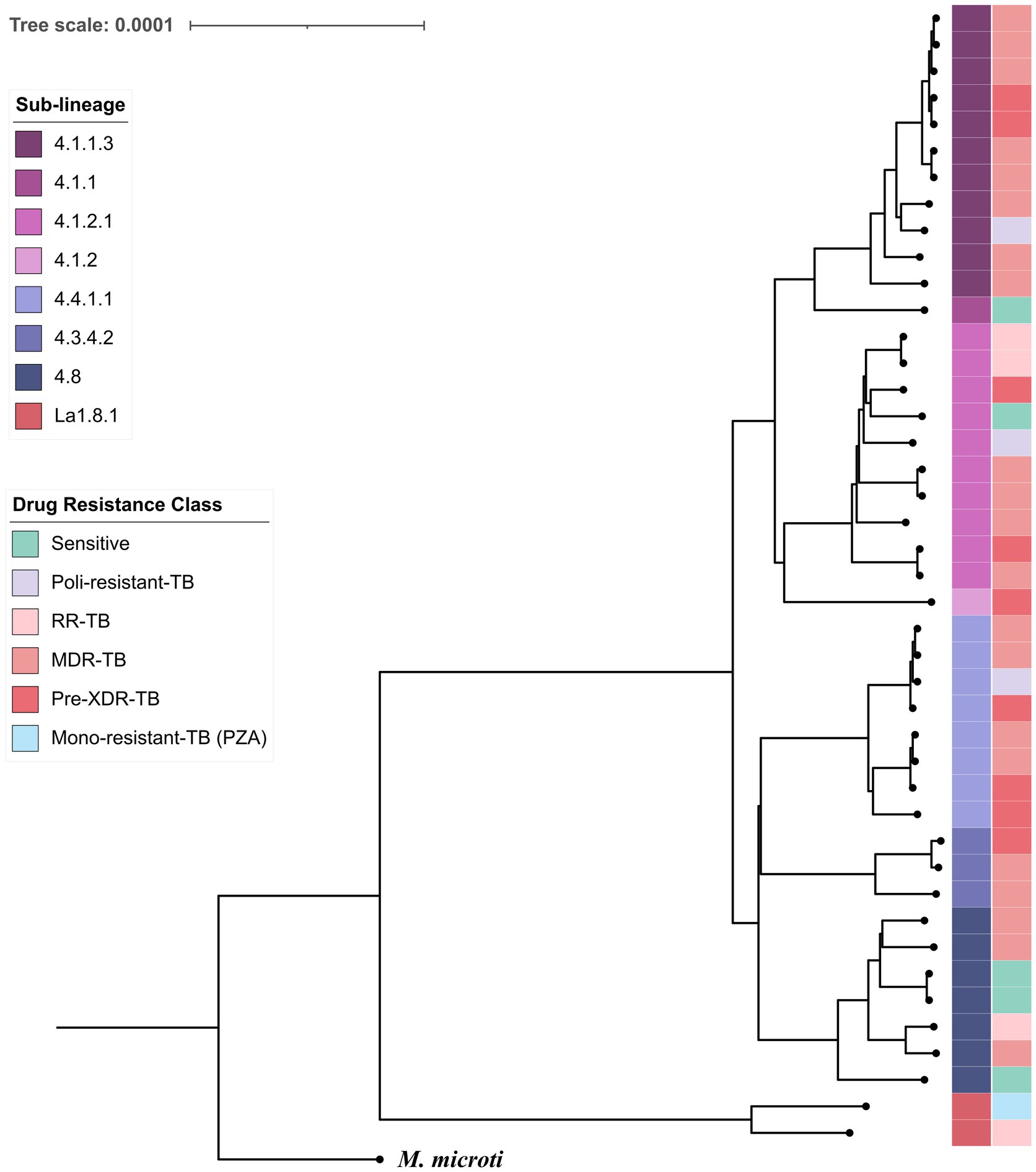 Figure 1. SNP-based phylogeny of MTBC isolates. The tree was inferred from 6,123 variable sites. Convergence was reached after 150 bootstrap replicates, meeting the standard cutoff of 0.03. Branches are annotated by sub-lineage and drug-resistance profile as determined by TB-profiler. Mycobacterium microti was included as the outgroup to root the tree.