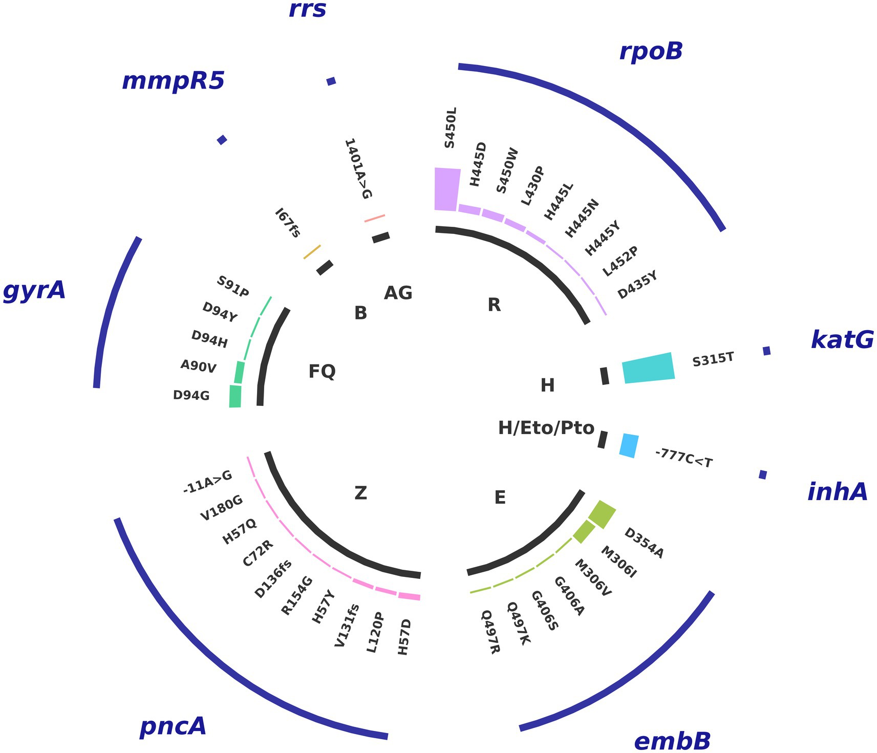 Figure 2. Distribution of mutations associated with resistance. Variants in genes associated with resistance to first-line and second-line antituberculosis drugs: R: rifampicin, H: isoniazid, Eto/Pto: ethionamide/proteonamide, E: ethambutol, Z: pyrazinamide, FQ: fluoroquinolones (moxifloxacin, levofloxacin), B: Bedaquiline, AG: aminoglycosides.