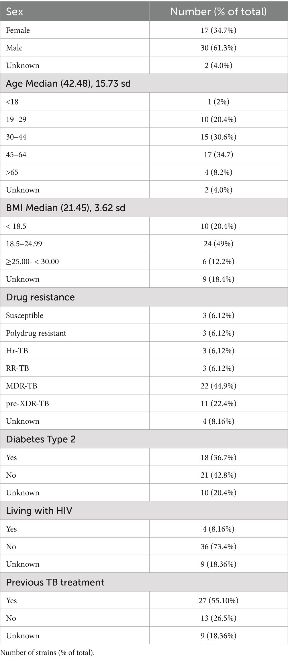 The samples for this study encompass mostly central and northern Mexico and include Ciudad de Mexico (24%), Baja California (18.5%), Estado de Mexico (16.6%), Guerrero (43.2%), Veracruz (9.2%), Puebla (5.5%), Hidalgo, Zacatecas, and Tamaulipas (each 1.8%). We specifically chose the highest resistant profile in the collections, focusing on MDR and Pre-XDR strains. Overall, the mean age of the patients was 42.5 years (range, 17–81), and 61.3% were men. The most common comorbidity was Type-2-Diabetes (36.7%), and 8% were living with HIV. Half of the patients had previous treatment at the time of sample collection, and 26% had no treatment recorded (see Table 1 for the full description of epidemiological data of the population sampled).