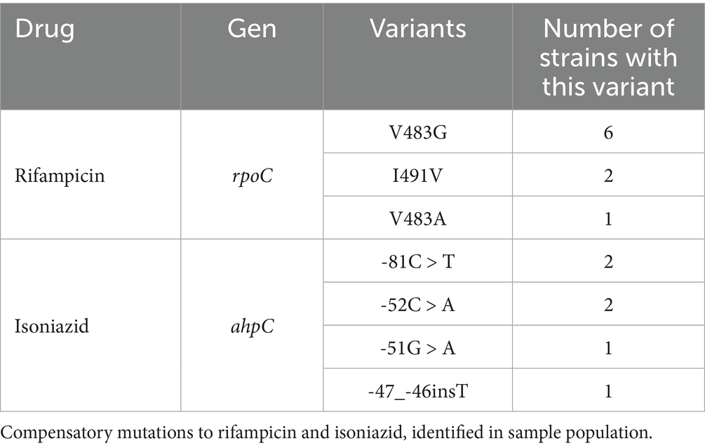 The bioinformatic analysis of the sequences was conducted using the methodology described by Cuevas-Córdoba et al. (2021). Briefly, removal adapters and low-quality reads (<30 Phred-scaled) were followed by the elimination of human, viral, and other bacterial sequences identified with SURPI (“Sequence-based ultrarapid pathogen identification”) (Naccache et al., 2014). Reads were then mapped to the Mtb reference strain H37Rv genome (RefSeq Accession: NC_000962.3). An overall genome coverage of > 278 fold (65–399 fold) was achieved. Variant calling relied on the GATK software with annotations provided by SnpEff software. Variants found in our analysis were classified as “Associated with Resistance,” “Not Associated with Resistance,” and “Uncertain” following a compiled database that includes WHO’s “Catalog of mutations in Mycobacterium tuberculosis complex and their association with drug resistance” 2nd edition (2023) and The CRyPTIC Consortium (2022). All variants excluded from these datasets were classified as “No Information.” A table with compensatory mutations was made based on reported studies (Comas et al., 2012; Conkle-Gutierrez et al., 2023; Napier et al., 2023; Billows et al., 2024). Furthermore, drug-efflux pumps previously associated with phenotypic resistance to antibiotics (Pal et al., 2014; Narang et al., 2017; Ghajavand et al., 2019; Raheem et al., 2020; Rodrigues et al., 2020; Laws et al., 2022; Hasan et al., 2024; Rao and Bhosale, 2024) were used to create an additional database. The lineage of MTB strains was determined using the software Mykrobe.1