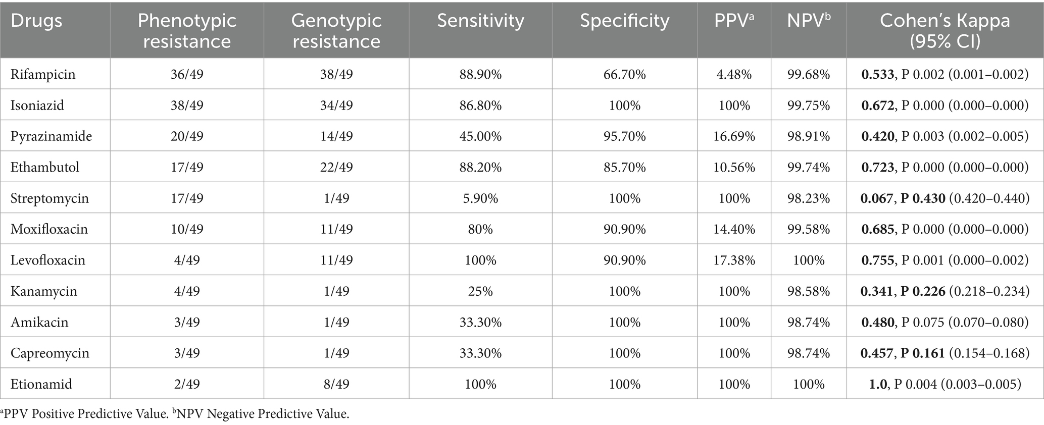 All statistical analyses were performed using SPSS v 25 (IBM SPSS Statistics, version 25). Clinical and demographic variables with normal distribution were expressed as median ± standard deviation (SD). Categorical variables were presented as frequencies (percentages) and compared using Fisher’s exact test; a two-tailed p value of <0.05 was considered statistically significant. Genotypic resistance for each drug was compared with the corresponding pDST. Sensitivity, specificity, positive predictive value (PPV), and negative predictive value (NPV) were calculated using a clinical calculator (Merck & Co, Inc., Rahway, NJ, United States, 2025). The strength of agreement between phenotype and genotype was determined with Cohen’s kappa coefficient. The Cohen’s Kappa values indicate agreement and are interpreted as follows: values ≤ 0 indicating no agreement, 0.01–0.20 as none to slight, 0.21–0.40 as fair, 0.41–0.60 as moderate, 0.61–0.80 as substantial, and 0.81–1.00 as almost perfect agreement (McHugh, 2012). The graphs were generated using R (R Version 2024.09.01 + 394, packages basic, ggplot2, reshape2, and tidyr).