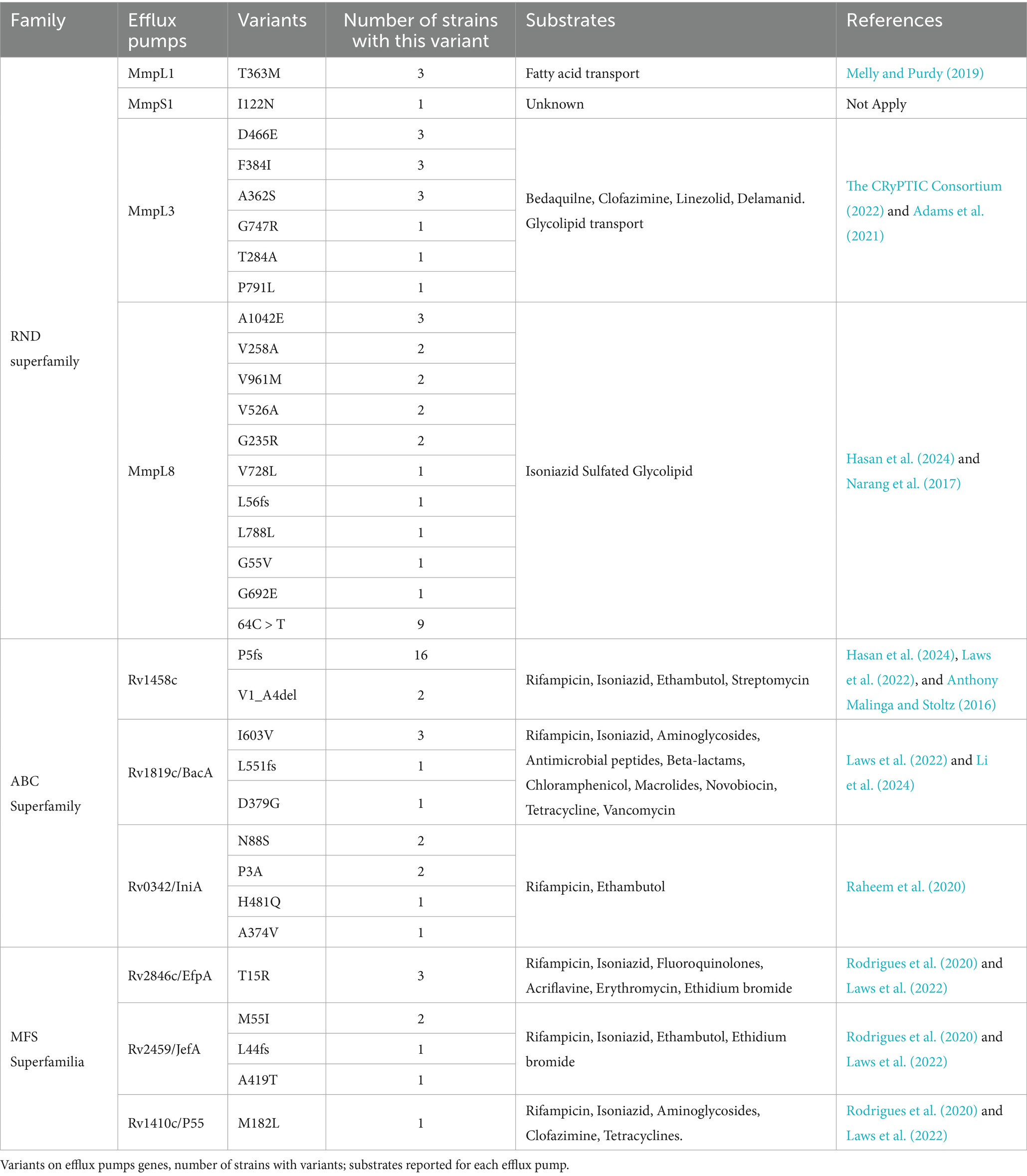 In this study, we found that 73% of the analyzed strains had efflux pump variants, the majority of which belonged to the ABC and RND superfamilies, previously associated with antibiotic resistance (Anthony Malinga and Stoltz, 2016; Laws et al., 2022; The CRyPTIC Consortium, 2022; Hasan et al., 2024). It is important to follow these patients through their treatment, as variations in efflux pumps may be the origin of resistance before fixation of mutations in drug targets (Laws et al., 2022). Future research on antibiotic resistance must include efflux pumps to gain a comprehensive understanding of resistance.