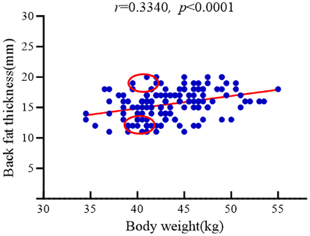 A total of 160 unsold Hu sheep ewes (8-month-old) from Xinzhongsheng Sheep Farm (Yulin City, Shaanxi Province) were subjected to body the weight and backfat thickness measurements. Backfat thickness was measured using A-mode ultrasonography (Renco Lean-Meater®, Minneapolis, MN, USA). To examine the relationship between these parameters, body weight data were visualized through scatter plots and analyzed via linear regression. Figure 1 demonstrates a statistically significant positive correlation between backfat thickness and body weight (r = 0.3340, P < 0.001), with both variables adhering to normal distribution patterns. From the cohort of 160 sheep, two experimental groups were established under same body weight (41 ± 0.5 kg) conditions: High Backfat (HBF) group (Backfat thickness = 19 ± 0.5 mm; n = 6) and Low Backfat (LBF) group (Backfat thickness = 11 ± 0.5 mm; n = 6). The dietary information for all participating Hu sheep is presented in Table 1.