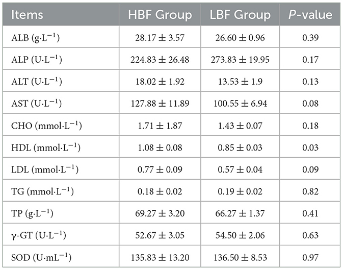 As summarized in Table 2, the HBF cohort demonstrated significantly higher HDL concentrations vs the LBF group (P < 0.05). Notably, the HBF group exhibited a trend toward elevated LDL and AST levels (0.05 < P < 0.10).