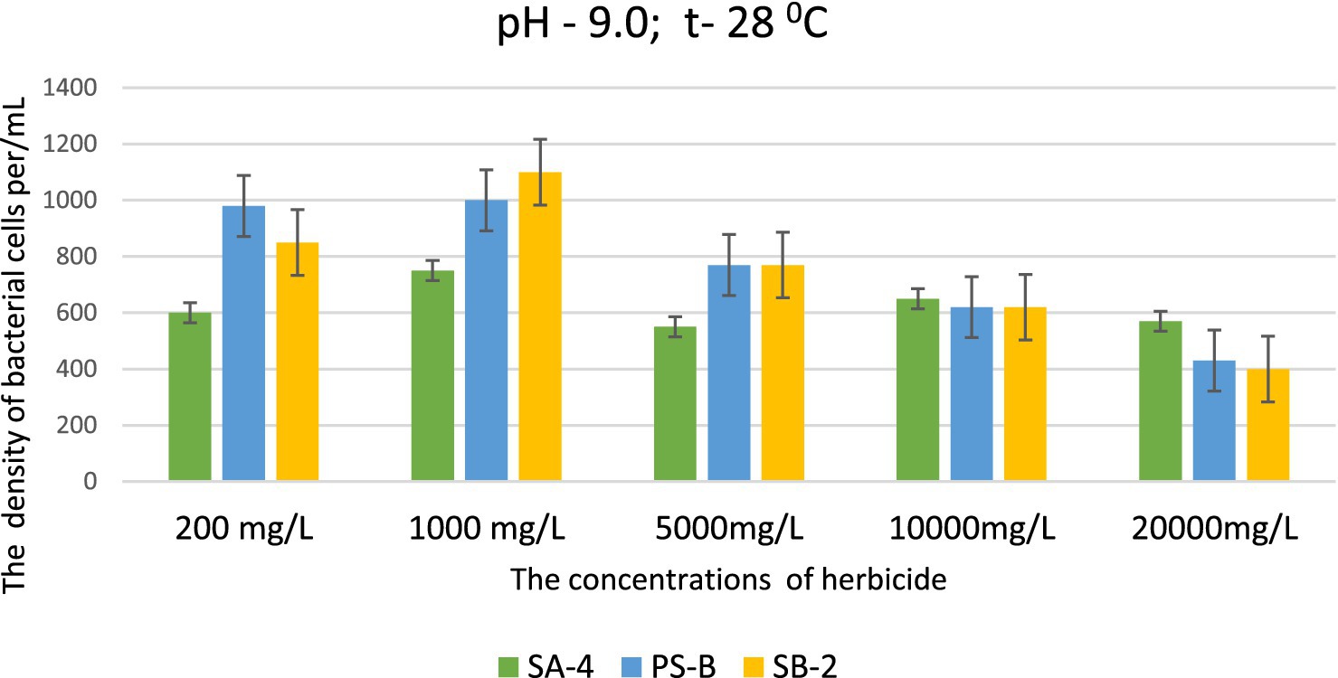 As stated above, the experiments were designed to test a liquid nutrient medium with varying pH levels and increasing doses of glyphosate. The results were analyzed using spectrophotometry at 550 nanometers, a repeated process to ensure accuracy (n = 3). The primary goal was to study the effects of glyphosate on degraded soils with alkaline pH levels (above pH 8) at a temperature of 28 °C. As the data in Figure 3 show, the three strains studied showed different cell concentrations at pH 8.0 under the influence of different doses of herbicide. For example, strain SA-4 showed almost uniform growth at all doses of the herbicide, with the number of cells ranging from 663 ± 0.91 at 200 mg/L to 651 ± 0.91 cells/mL at 10000 mg/L of herbicide concentration. A noticeable decrease in the number of cells occurred only at a herbicide dose of 20,000 mg/L, but complete inhibition of growth did not occur. In contrast to other strains, Strain SB-2 demonstrated a more stable position, accumulating more biomass at nearly all doses, suggesting increased viability in an alkaline environment with elevated herbicide concentrations. For instance, this strain grew at herbicide concentrations of 200 mg/L and 1,000 mg/L, reaching 1,102 and 1,088 ± 0.91 cells/mL, respectively. This suggests that in a slightly alkaline environment (pH 8.0), the cells of this bacterium effectively absorb these herbicide doses. At higher concentrations of 5,000 and 10,000 mg/L, the bacterium also exhibited vigorous growth, resulting in a significant increase in cell numbers. A noticeable decrease in cell count was only observed at a herbicide dose of 20,000 mg/L, although complete growth inhibition did not occur at this level. In summary, the bacterium cells absorb herbicides well at pH 8, and growth inhibition is evident at 20000 mg/L herbicide exposure.