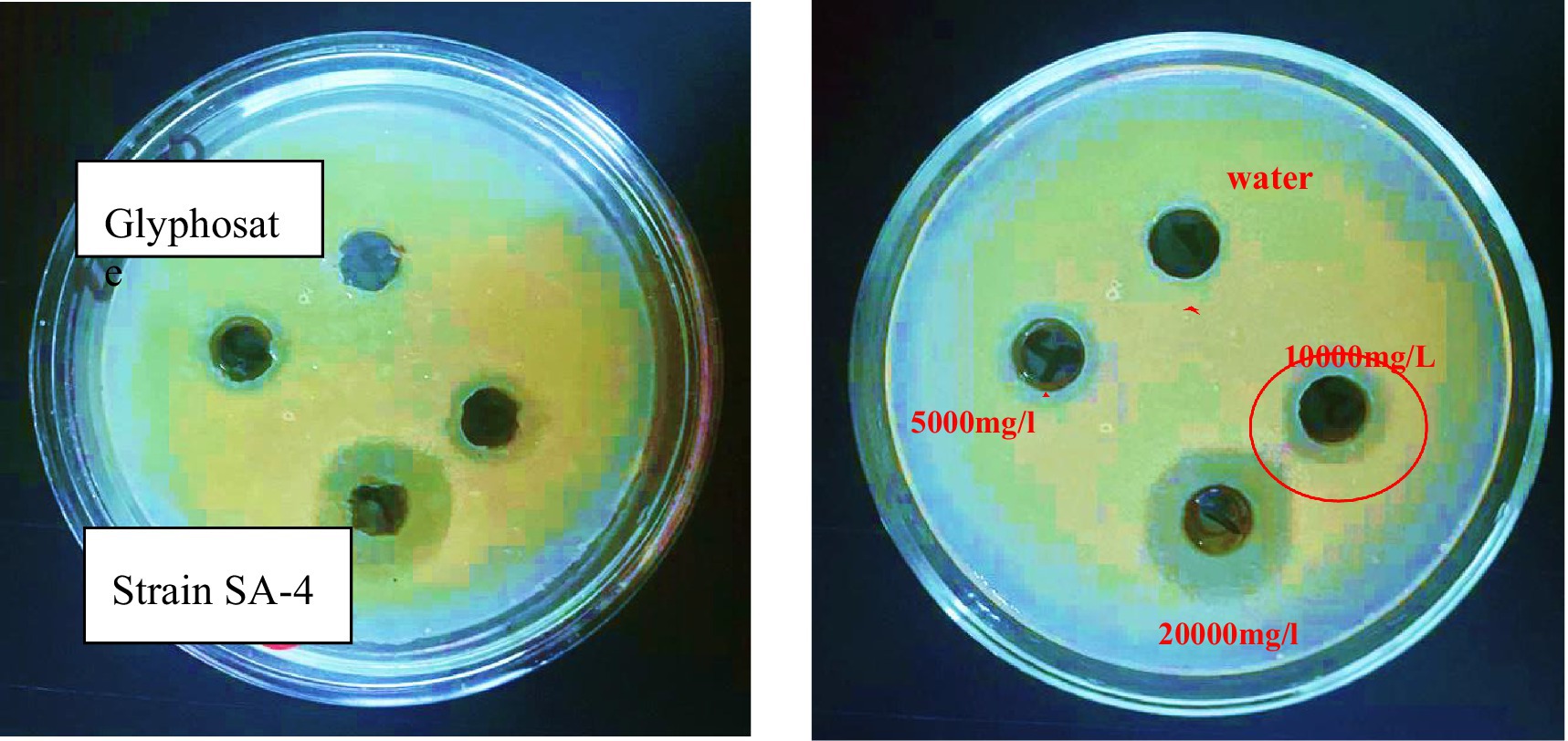 The Environmental Protection Agency issues regulations to establish, modify, suspend, or repeal tolerance limits (TLs)—the maximum allowable concentrations of pesticide residues in food. These limits are set at levels that ensure a reasonable certainty of no harm to consumers (EPA, 2025). This Agency establishes acceptable glyphosate residue limits for many crops consumed by humans and animals—including corn, soybeans, oilseeds, grains, fruits, and vegetables—with permissible levels ranging from 0.1 to 400 parts per million (ppm), (Environmental Topics, Chemicals, Pesticides and Toxics Topics) (European Food Safety Authority, 2023). The threshold concentration of glyphosate in soil is 0.5 mg/kg (FAO, 2004, 2011). Local farmers have confirmed that the maximum concentration of glyphosate used in agricultural fields ranges from 1,200 to 1,500 mg per hectare, depending on the soil and climatic conditions of the region. For the first series of tests in liquid media, solution concentrations of 50, 100, 200, 1,000, and 5,000 mg/L were selected, several times higher than the standard dose. Microorganism growth was abundant at solution concentrations of 50, 100, 200, and 1,000 mg/L, with noticeable inhibition occurring only at 5000 mg/L. For the second test series in solid medium, glyphosate concentrations were increased to 5,000 mg/L, 10000 mg/L, and 20,000 mg/L respectively, corresponding to 10,000, 20,000, and 40,000 times the standard dose of 0.5 mg/kg. Laboratory strains SB-2, SA-4, and Ps-B were inoculated onto Petri dishes. Once the agar solidified, four wells were created in each dish, and 0.3 mL of a solution containing glyphosate at concentrations of 5,000, 10,000, and 20,000 mg/L was added to each well. The Petri dishes were then incubated at 27 °C for 24 h to facilitate the diffusion of glyphosate. Three replicates of each strain were meticulously carried out for each concentration to ensure the reliability of the results. Distilled water was employed as a control.