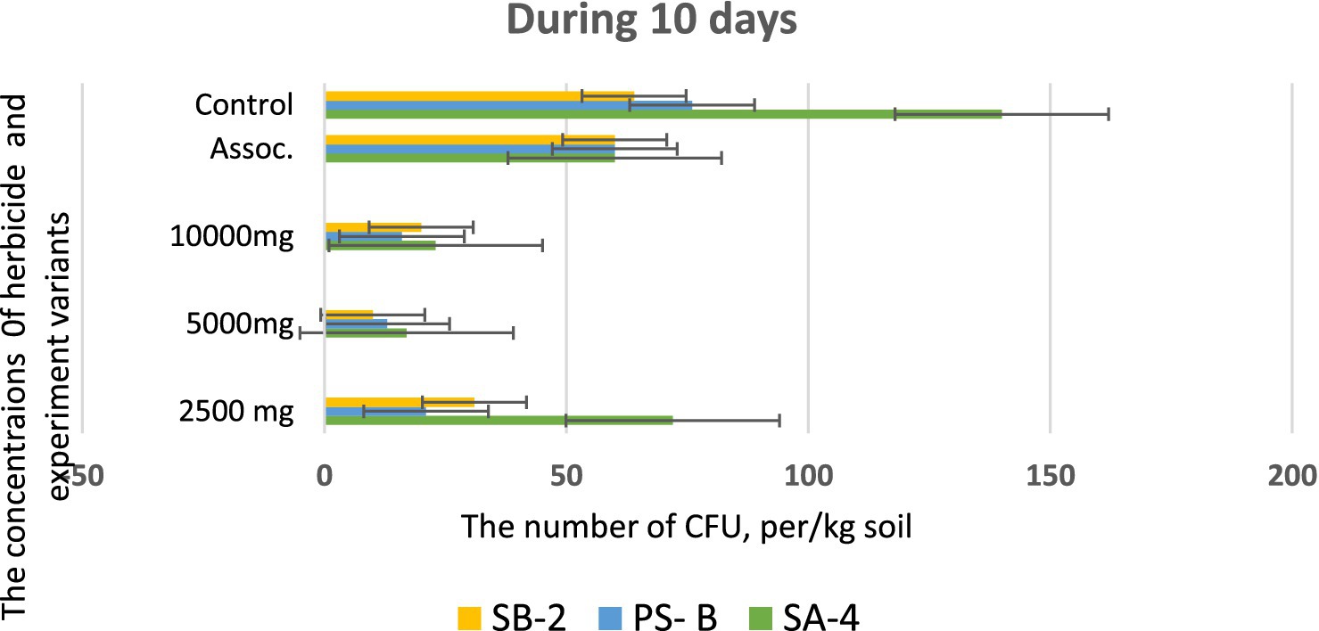 Following the initial screening, the degradation ability of glyphosate was tested in the laboratory on sterile soil that had not previously been exposed to the herbicide. The soil was disinfected by autoclaving for three consecutive days at 121 °C for 20 min. Different concentrations of glyphosate were mixed with the soil by adding sterile water and 10 mL of bacterial suspension (1х108 cells/ml). Variants without added bacteria and without glyphosate served as controls. Soil samples were collected every 10 days and inoculated on nutrient media using the serial dilution method. The ability of three isolates to break down glyphosate at concentrations of 2.500 mg/kg, 5,000 mg/kg and 10,000 mg/kg was assessed. Intermediate products of glyphosate decomposed in the soil by isolates were assessed after 40 days. The final results of the studies were validated by sowing wheat seeds in these soils after 40 days. As shown in Figure 9, soils mixed with varying doses of glyphosate and incubated with bacterial cultures produced the following results after 10 days. At a high dose of 5,000 mg/kg, all strains exhibited similar outcomes, with the number of colony-forming units (CFUs) ranging from 25.0 ± 0.01 to 35.0 ± 0.01 per kg of soil. In contrast, at a lower dose of 2,500 mg/kg of glyphosate, the SA-4 strain demonstrated significantly better performance, achieving 75.0 ± 0.01 CFUs per kg of soil. Strain SB-2 also exhibited active reproduction at this concentration, yielding 36.0 ± 0.01 CFUs per kg of soil.