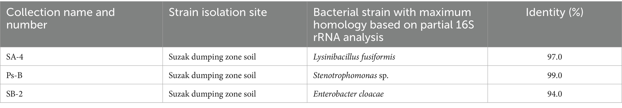 Three bacterial strains, Stenotrophomonas sp. Ps-B, Lysinibacillus fusiformis SA-4, and Enterobacter cloacae SB-2, were selected for trials in media with varying herbicide concentrations. These bacterial species were isolated in the laboratory from heavily pesticide-polluted soil in southern Kyrgyzstan (Table 1) and identified to the species using classical microbiological and PCR analysis. The 16S ribosomal RNA (rRNA) gene sequences were deposited in the GenBank and DB of the National Center for Biotechnology Information nucleotide sequence databases (Doolotkeldieva et al., 2018).