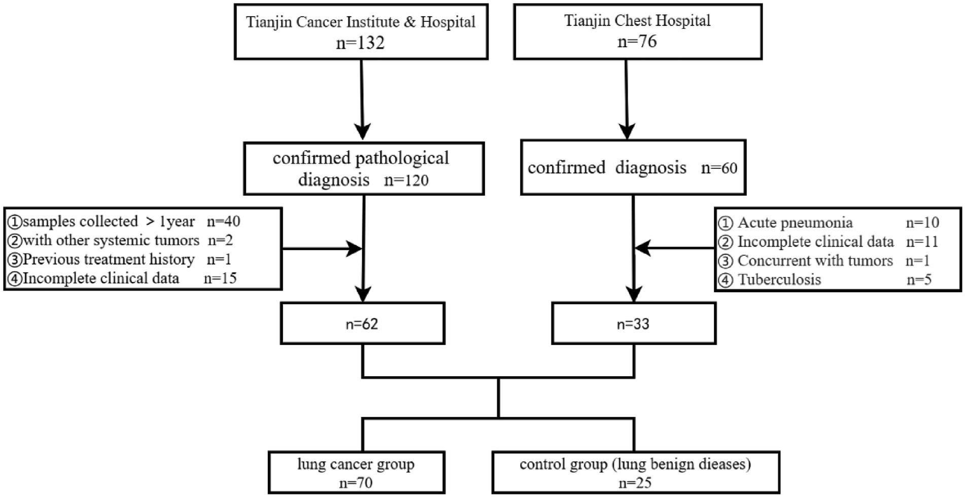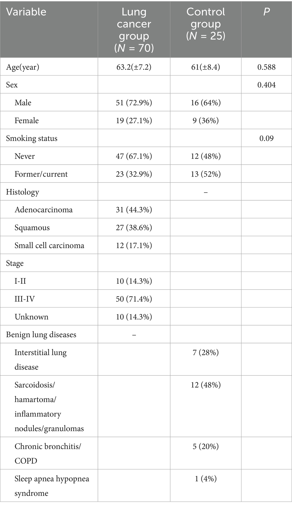From October 2022 to October 2023, 70 lung cancer patients and 25 patients with benign lung diseases were enrolled from Tianjin Cancer Institute & Hospital and Tianjin Chest Hospital. The baseline characteristics of these groups are presented in Table 1. The lesions in the control group included interstitial lung disease and lesions appearing as nodules or tumor-like masses on imaging, which require differentiation from lung cancer, such as sarcoidosis, hamartoma, inflammatory nodules, and granulomas. Chronic bronchitis and COPD were also noted in the control group. Both groups were comparable in terms of age, sex, and smoking history.