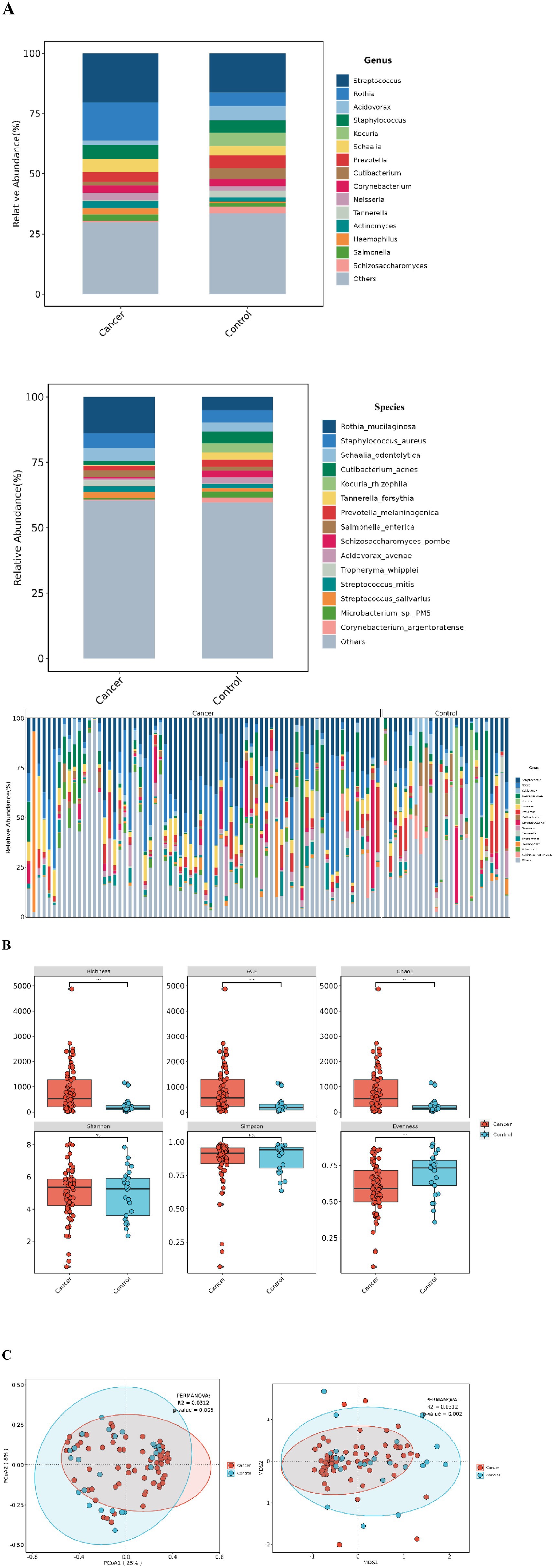 Metagenomic sequencing was used to identify microbial species at the genus and species levels. At the genus level, 1,678 genera were detected, including various viruses and archaea. However, due to their low abundance, they were not further analyzed. Among the top 15 most abundant bacterial genera, similar genera were observed in both groups, although their proportions varied. In the lung cancer group, dominant genera included Streptococcus (20.27%), Rothia (15.88%), Staphylococcus (5.78%), Schaalia (5.44%), Prevotella (4.03%), Corynebacterium (3.10%), and Neisseria (3.03%). In the control group, dominant genera were Streptococcus (16.23%), Rothia (5.66%), Acidovorax (5.99%), Kocuria (5.56%), Prevotella (5.41%), Cutibacterium (4.51%), and Schaalia (3.73%). At the species level, 5,748 species were identified, with differences in species abundance between the groups. The most abundant species in the lung cancer group were Rothia mucilaginosa (13.86%), Staphylococcus aureus (5.72%), and Schaalia odontolytica (4.98%). In the control group, the most abundant were Rothia mucilaginosa (5.13%), Staphylococcus aureus (4.65%), Cutibacterium acnes (4.50%), Kocuria rhizophila (3.55%), and Schaalia odontolytica (3.46%) (Figure 2A).