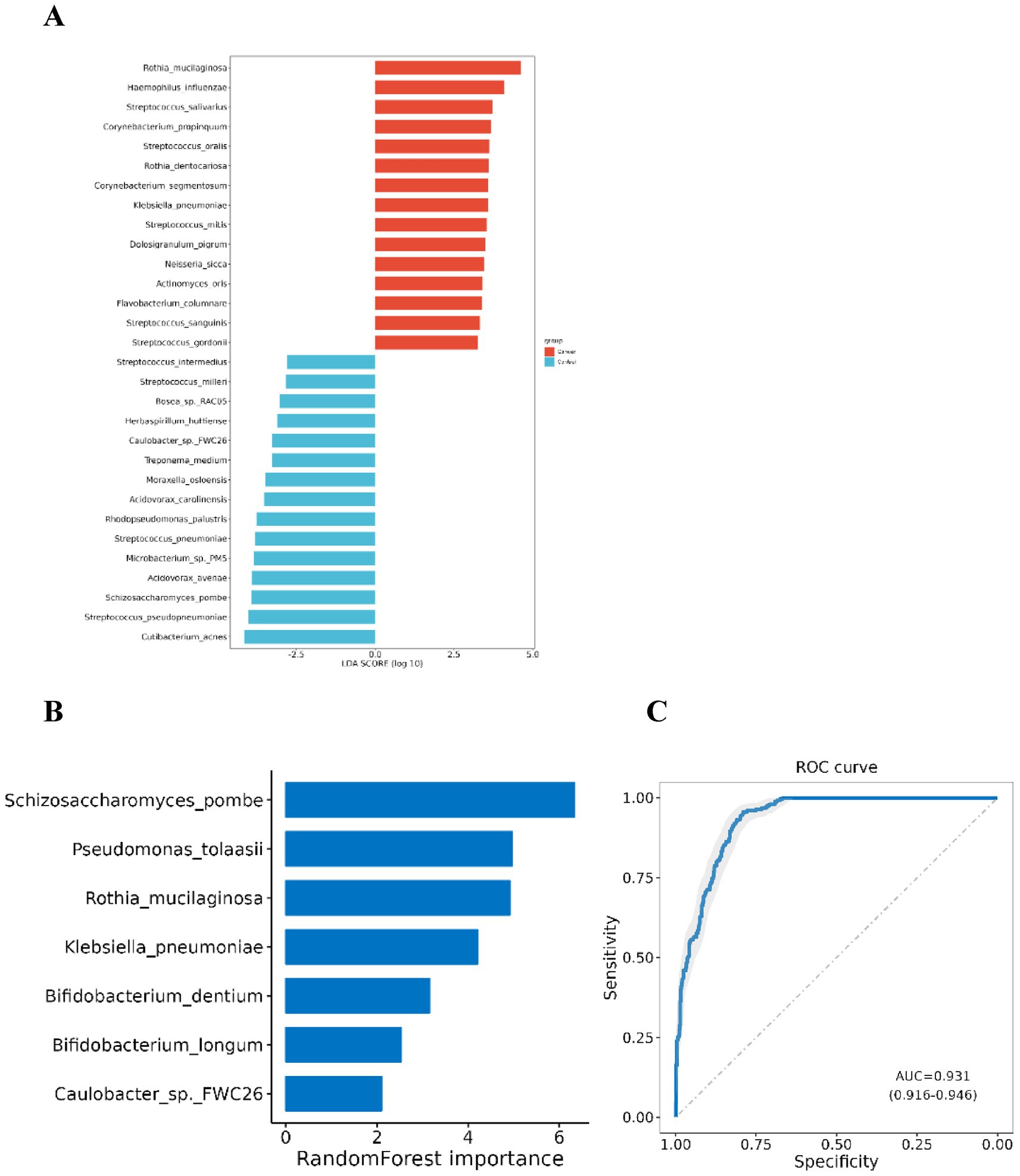 Figure 3. Differential microbial species between lung cancer group and control group. (A) Differential taxa at the species level identified by LEfSe analysis (Only species with a differential species count greater than 15 and in each group LDA score Top 15 are listed); (B) Species selected in the diagnostic model. (C) ROC curve for the diagnostic model.