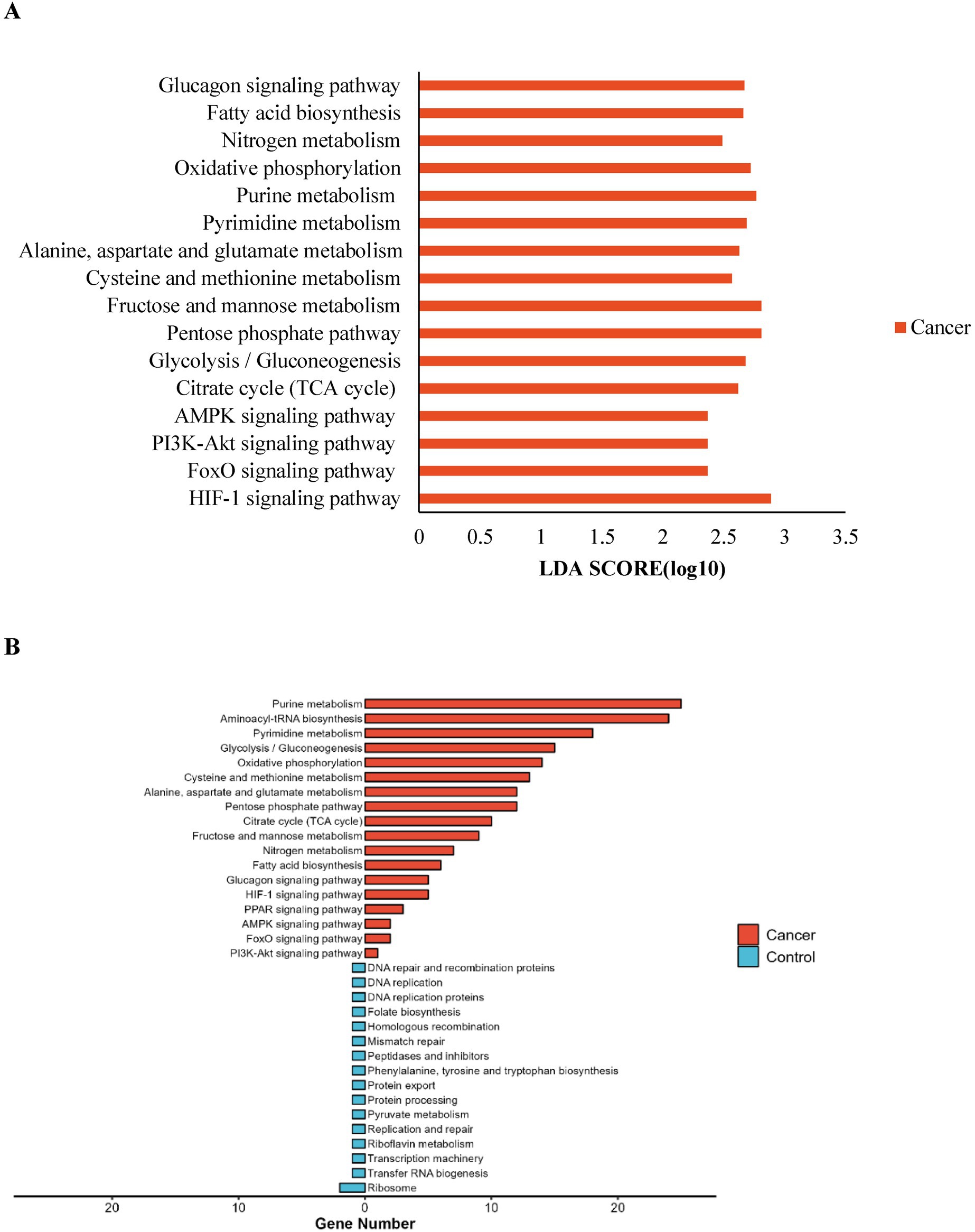 Figure 4. Prediction of lung microbiota function. (A) The impact of differentially enriched KEGG pathways in lung cancer group was evaluated through the LDA score; (B) Number of genes annotated in the differential KEGG pathways.