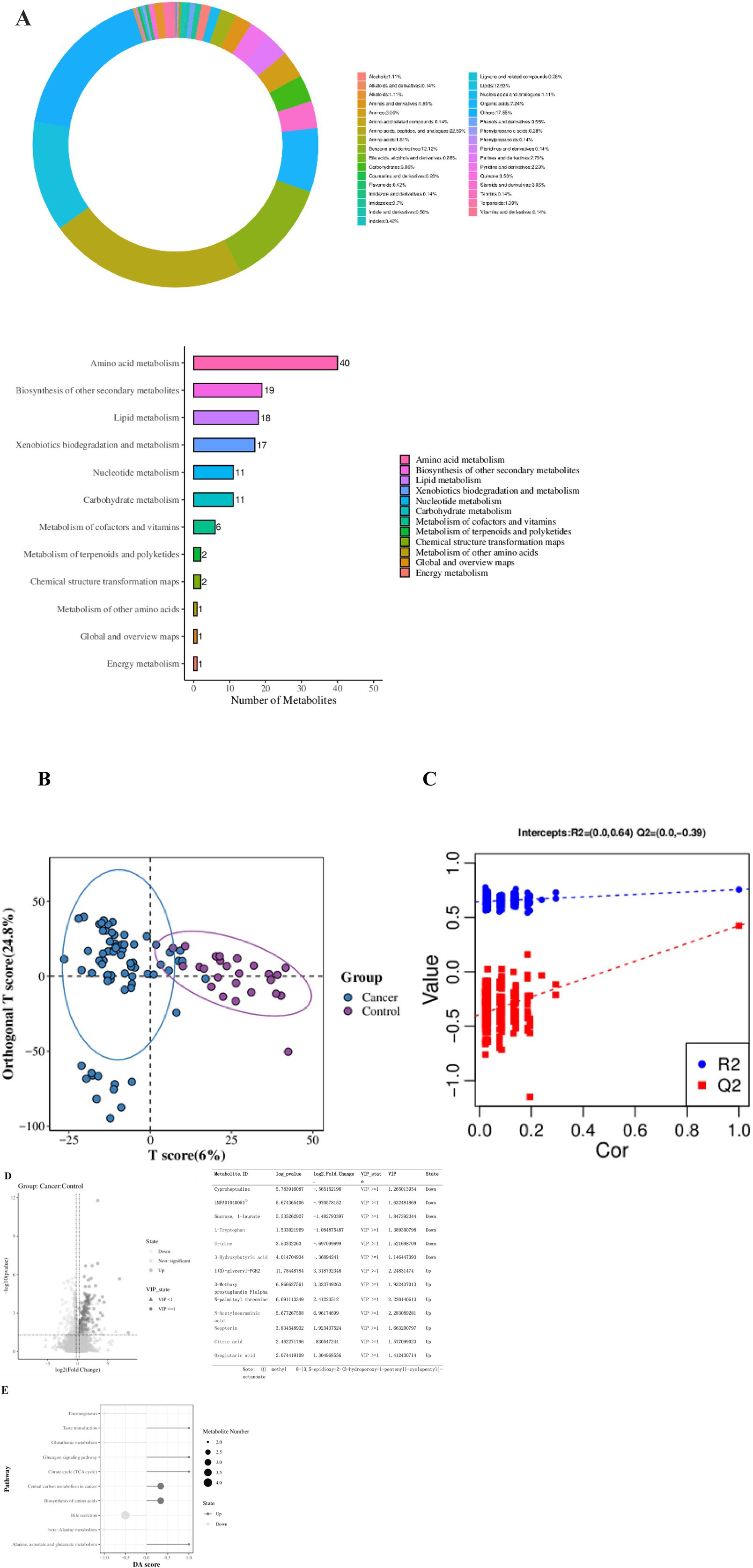 Figure 5. Metabolite Classification and Function Prediction. (A) Metabolite classification of the two groups. (B) Score diagram of the OPLS-DA analysis model. (C) Replacement test chart of the OPLS-DA analysis model. (D) Volcano plot of differential metabolites (Fold Change calculated for each metabolite in each group and significance tested using Student’s t-test: VIP ≥ 1 in the OPLS-DA model, Fold Change ≥ 1.2 or ≤ 0.83, p-value < 0.05). The list shows the top three metabolites that are significantly upregulated or downregulated, as well as the metabolites we are concerned about. (E) Metabolic KEGG pathway enrichment analysis.