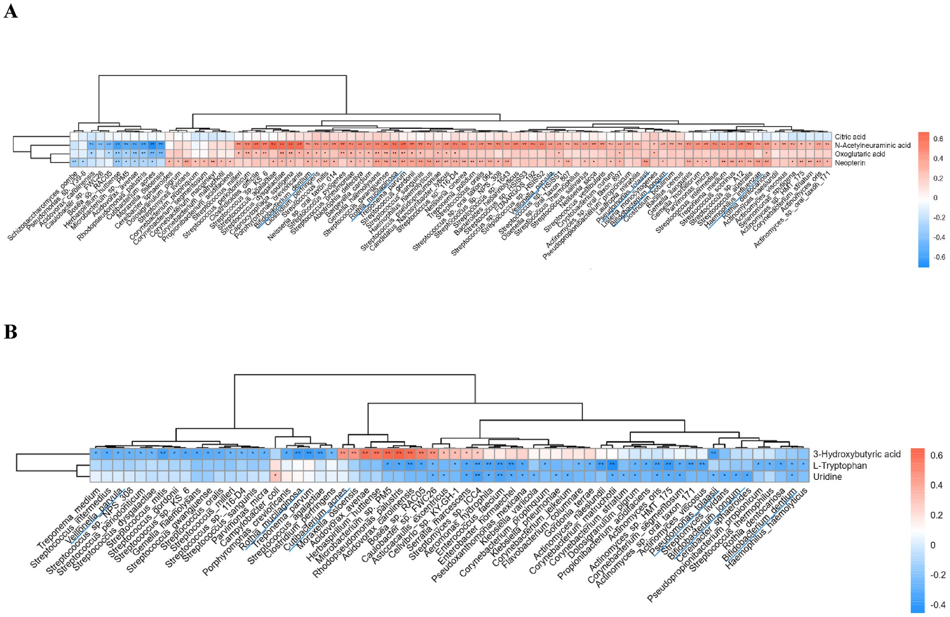 Figure 6. Correlation analysis of differential metabolites and microbial species. (A) Correlation of upregulated metabolites in the lung cancer group with microbiota; (B) Correlation of downregulated metabolites in the lung cancer group with microbiota. **p < 0.01, *p < 0.05.