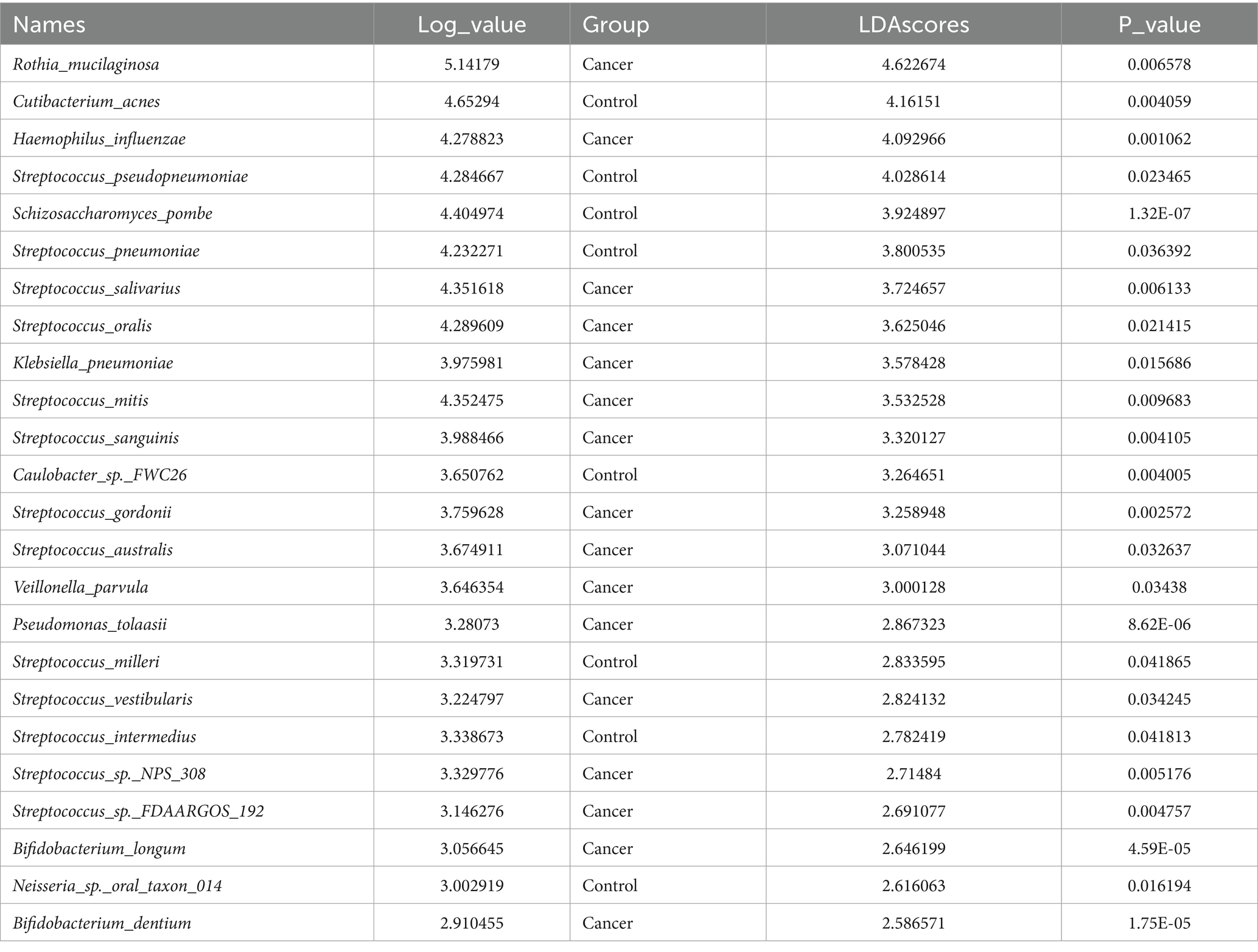 Table 2. List of different microbial species in lung cancer group and control group by LEfSe analysis (LDA > 2.5).