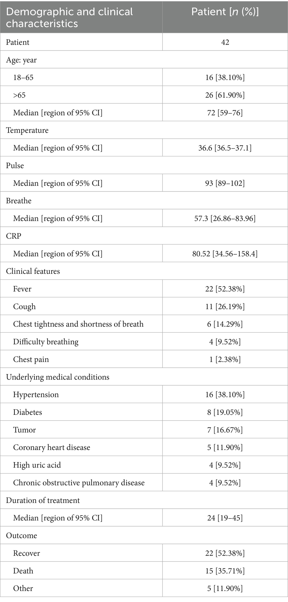The demographic and clinical characteristics of the patients with suspected Acinetobacter baumannii infection are provided in Table 1. As shown in the table, 26 cases (61.90%) were older than 65 years, and the median age was 72 years. In terms of clinical manifestations, fever was observed in 22 patients (52.38%), cough in 11 patients (26.19%), difficulty breathing in six patients (14.29%), chest tightness and shortness of breath in four (9.52%) patients, and chest pain in one patient (2.38%). Within this patient group, 16 (38.10%) individuals were hypertensive, eight (19.05%) had diabetes, seven (16.67%) were diagnosed with cancer, five (11.90%) had coronary heart disease, and four (9.52%) had hyperglycemia and experienced chronic obstructive pulmonary disease. The clinical outcomes revealed that 22 patients were discharged after recovery, 15 patients unfortunately passed away, and the status of five patients remains undetermined (see Figure 1).