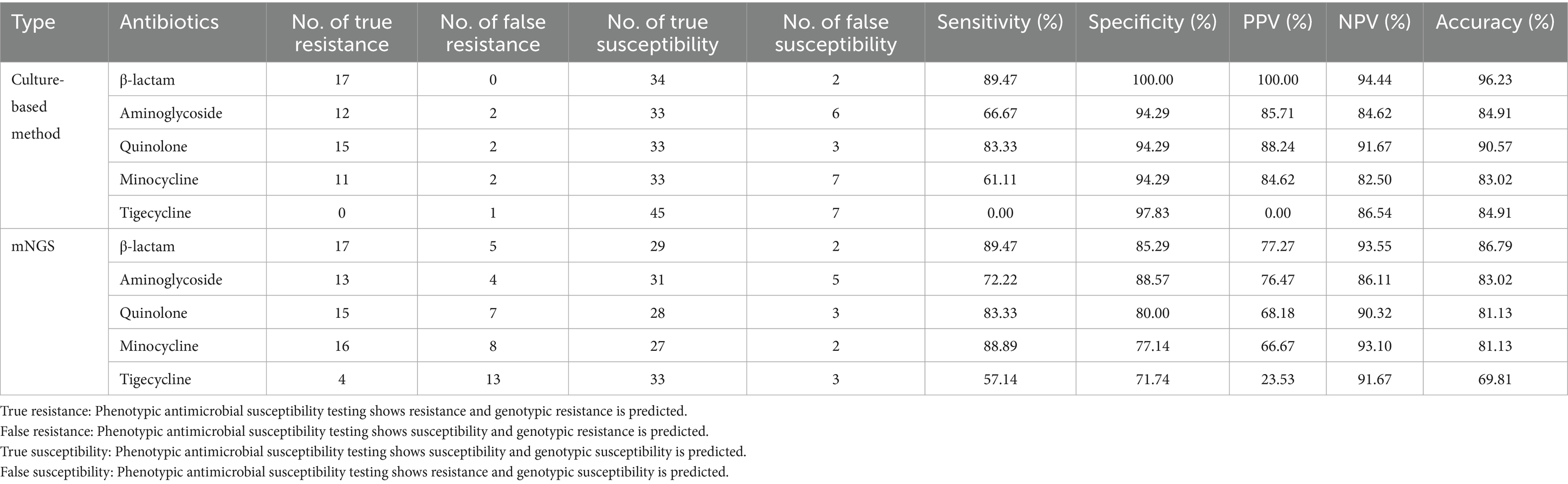 In conclusion, our findings demonstrate that mNGS achieves high concordance with phenotypic antimicrobial susceptibility testing and clinical evaluations in profiling drug resistance of Acinetobacter baumannii. With predictive values for β-lactams, aminoglycosides, fluoroquinolones, and minocycline, mNGS shows considerable promise as a robust adjunct to conventional methods for guiding antimicrobial therapy. Importantly, future integration of artificial intelligence and machine learning has the potential to enhance interpretive frameworks, enable more comprehensive resistome characterization, and ultimately support the advancement of precision antimicrobial stewardship.