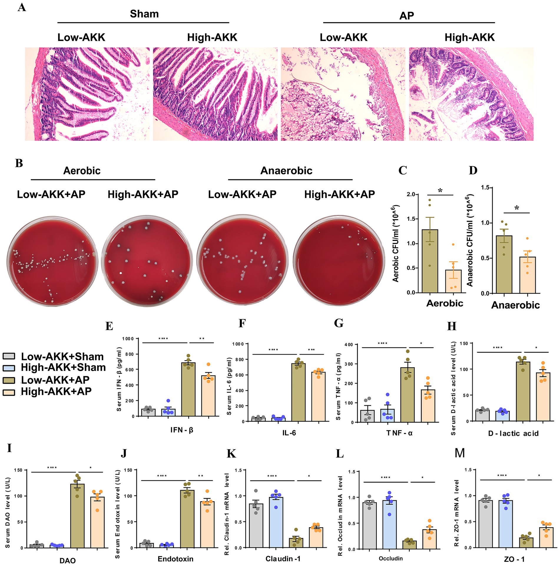 Figure 2. AKK improve intestinal barrier function and alleviate AP-related intestinal injury. (A) H&E staining of intestinal sections from sham and AP-treated rats, with low and high doses of AKK therapy (n = 5). (B) Representative images of bacterial cultures on petri dishes under aerobic and anaerobic conditions. (C,D) Bar graphs show quantitative analysis of bacterial loads (colony-forming units, CFU) in peritoneal lavage fluid (PLF) under aerobic (C) and anaerobic (D) conditions (n = 5). (E-J) Bar graphs display serum levels of IFN-β (E), IL-6 (F), TNF-α (G), D-lactic acid (H), DAO (I), and endotoxin (J) (n = 5). (K-M) The mRNA levels of Claudin-1 (K), Occludin (L), and ZO-1 (M) of the small intestinal tissues.