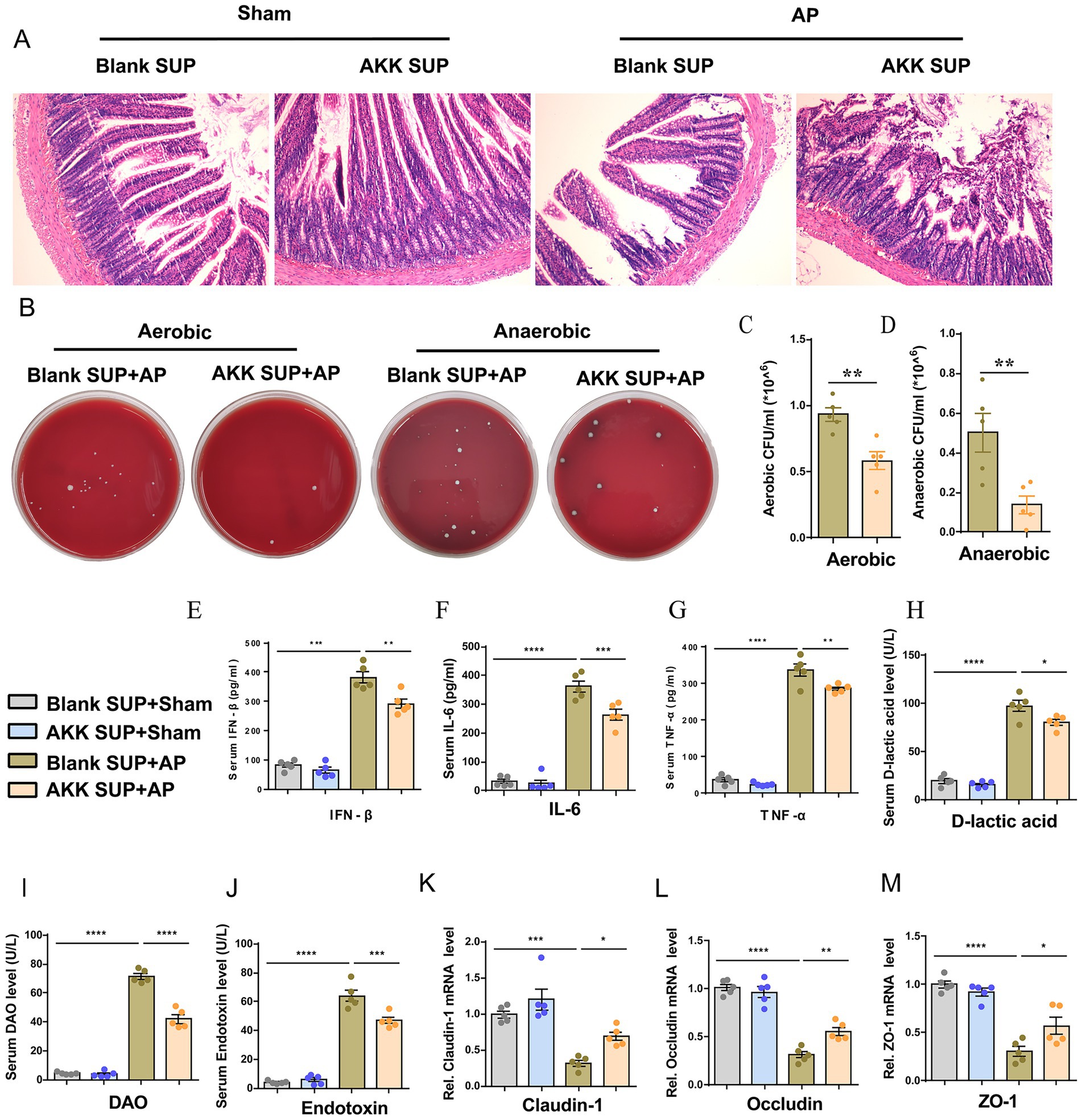 Figure 4. Live bacteria AKK produce active metabolites that alleviate AP-related intestinal injury. (A) H&E staining of intestinal sections from sham and AP-treated rats, with blank and live AKK supernatants (n = 5). (B) Representative images of bacterial cultures on petri dishes under aerobic and anaerobic conditions. (C,D) Bar graphs show quantitative analysis of bacterial loads (colony-forming units, CFU) in peritoneal lavage fluid (PLF) under aerobic (C) and anaerobic (D) conditions (n = 5) (E–J) Bar graphs display serum levels of IFN-β (E), IL-6 (F), TNF-α (G), D-lactic acid (H), DAO (I), and endotoxin (J) (n = 5). (K-M) The mRNA levels of Claudin-1 (K), Occludin (L), and ZO-1 (M) of the small intestinal tissues.