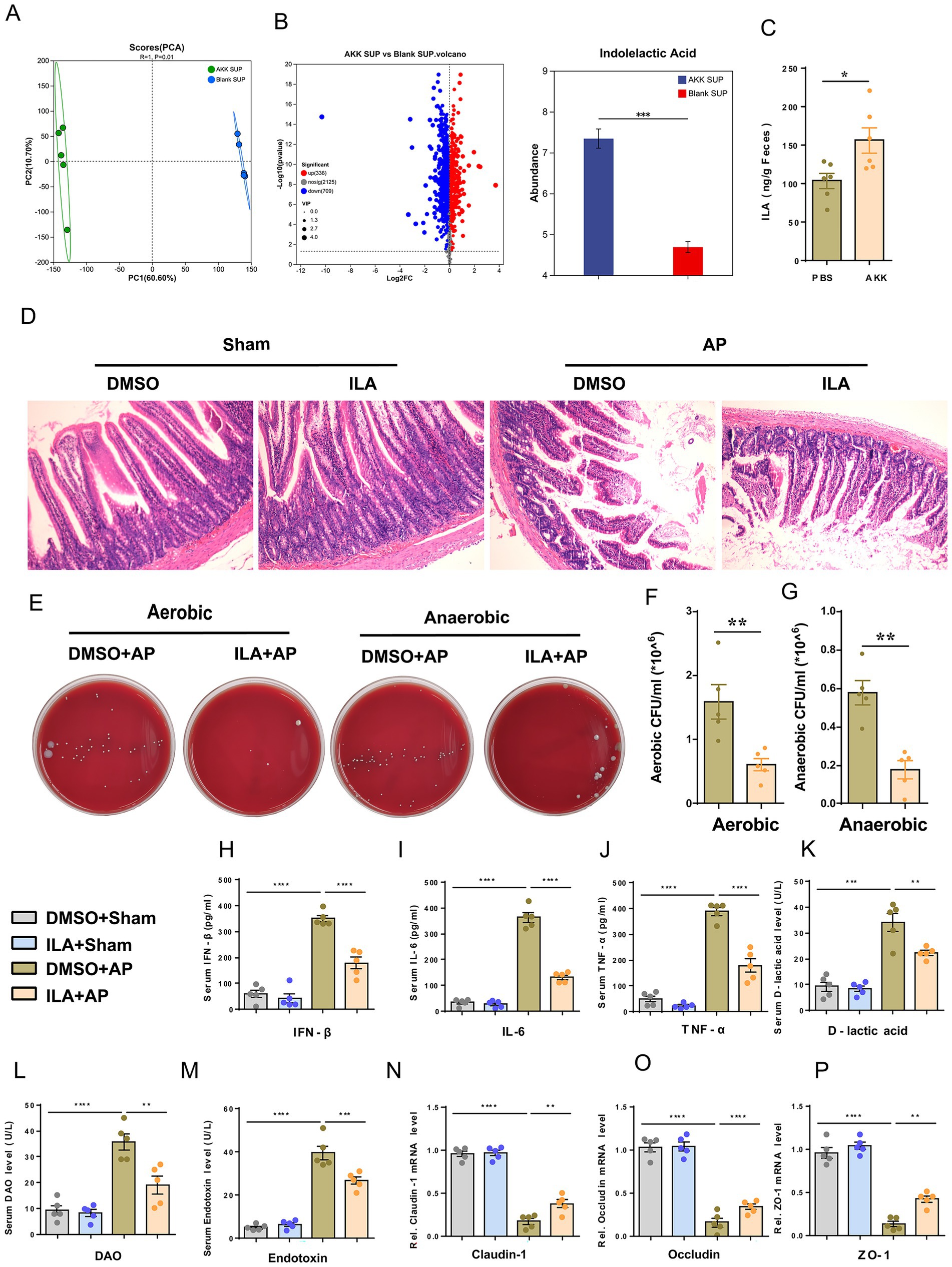 Figure 5. ILA alleviates AP-related intestinal injury. (A) Scatter plots of PCA of non-targeted metabolomics analysis from blank and live AKK supernatants (n = 5). (B) Volcano plot of non-targeted metabolomics analysis (AKK group vs blank group). (C) ILA concentration in cecum contents of germ-free (GF) rats gavaged with live AKK or vehicle (n = 5). (D) H&E staining of intestinal sections from sham and AP-treated rats, with blank and live AKK supernatants (n = 5). (E) Representative images of bacterial cultures on petri dishes under aerobic and anaerobic conditions. (F, G) Bar graphs show quantitative analysis of bacterial loads (colony-forming units, CFU) in peritoneal lavage fluid (PLF) under aerobic. (F) and anaerobic (G) conditions (n = 5). (H–M) Bar graphs display serum levels of IFN-β. (H), IL-6 (I), TNF-α (J),D-lactic acid (K), DAO (L), and endotoxin (M) (n = 5). (N-P) The mRNA levels of Claudin-1 (N), Occludin (O), and ZO-1 (P) of the small intestinal tissues.