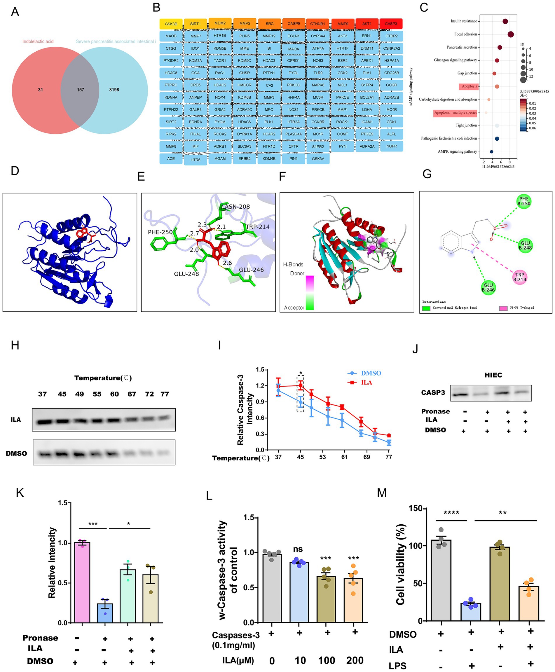 Figure 6. ILA alleviates intestinal injury by directly targeting CASP3 and inhibiting apoptosis. (A) Venn diagram showing overlapping genes between ILA (indolelactic acid) potential targets and AP-related intestinal injury genes. (B) List of the overlapping genes from the Venn diagram. (C) KEGG pathway analysis bar chart showing the common targets are significantly enriched in the Apoptosis and Focal Adhesion pathways. (D-G) Molecular docking models predict the binding conformation between ILA and the CASP3 protein. (H,I) DARTS assay validates the binding of ILA to CASP3, showing protein stability. (J,K) CETSA further confirms the ILA-CASP3 interaction by demonstrating thermal stability shift. (L) Bar graph shows ILA concentration-dependently inhibits Caspase-3 activity in human intestinal epithelial cells (HIECs), using Raptinal as a positive control inhibitor. (M) Bar graph demonstrates that ILA has no significant toxic effect on HIEC viability across tested concentrations.