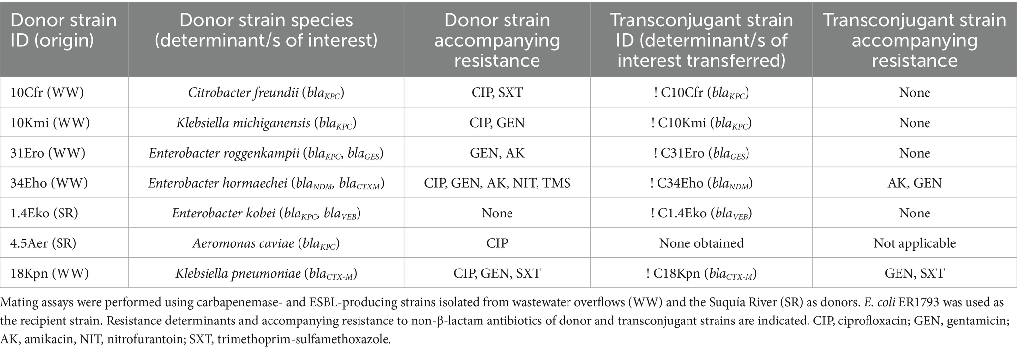 These results indicate that ESBL and carbapenemase genes in Enterobacterales from wastewater overflows and the Suquía River are mainly encoded on transferable plasmids, highlighting their potential for horizontal dissemination.