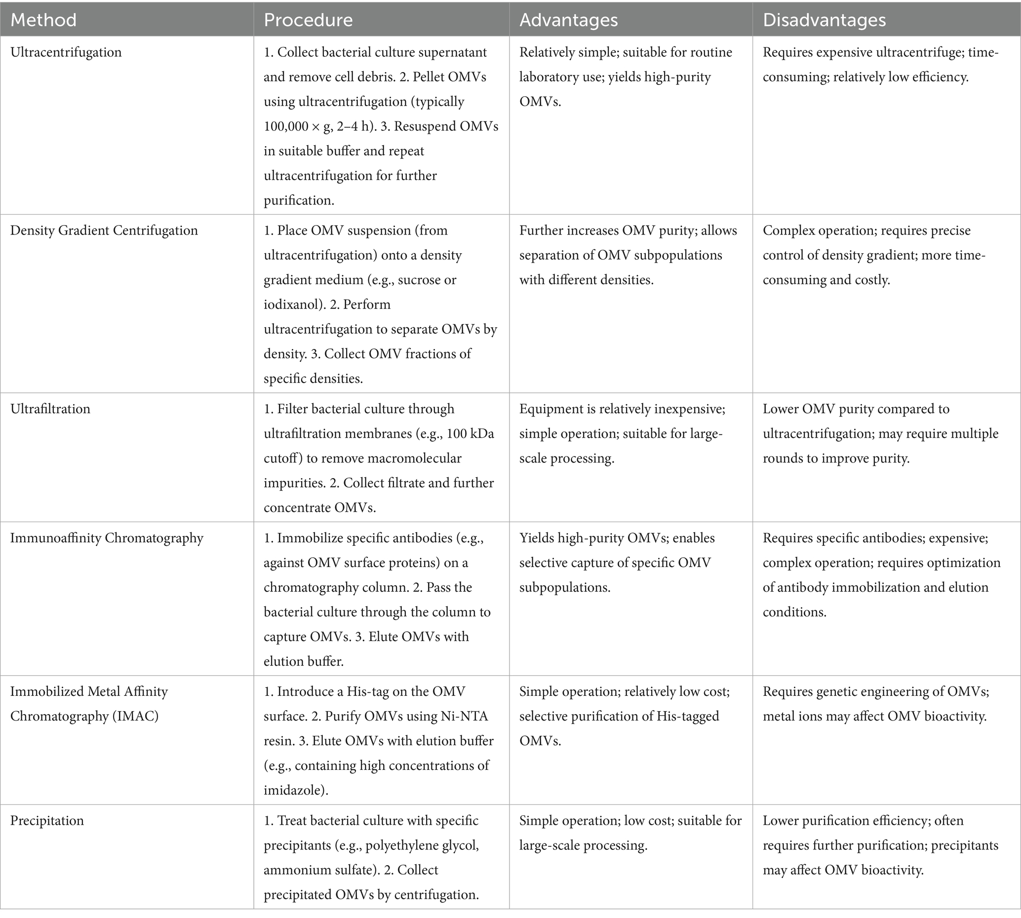 For OMVs to be applied clinically, efficient, rapid, and stable extraction methods that preserve the structural integrity and biological functionality of OMVs are essential (Preto et al., 2025). Current techniques for OMV isolation and purification each have their advantages and disadvantages. Common laboratory methods for OMV isolation include ultracentrifugation, density gradient centrifugation, ultrafiltration, and immunoaffinity chromatography (Table 1). Researchers should choose different isolation methods based on their laboratory conditions and experimental objectives.