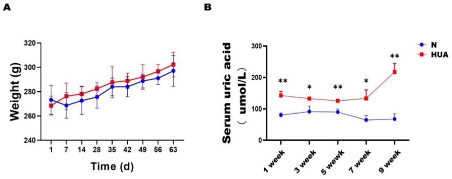 There was no significant difference in body weight between the HUA and normal (N) groups (Figure 1A). The UA content in the HUA group was significantly higher than that in the N group from the 1st to the 9th week (Figure 1B).