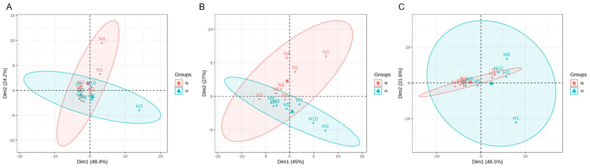 Figure 2. Dysregulated bile acid principal component in the HUA rats. (A–C) Principal component analysis (PCA) score plot of serum (A), liver (B), and ileum contents. (C) Bile acid profiles. Principal component analysis (PCA) of groups N and H. The separation between the groups was visualized in the PCA plots and further validated by the PERMANOVA (Adonis) test based on the Bray–Curtis/Euclidean distance matrices, which confirmed significant differences between the groups (p < 0.05).