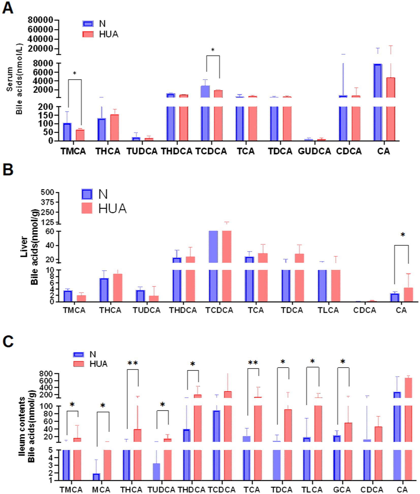 To explore the dynamic changes of BAs, we collected the serum, liver, and ileum contents of N and HUA group rats. In serum, we found that taurochenodeoxybile acid (TCDCA) and tauro-muribile acid (TMCA) decreased significantly compared with the N group (Figure 3A). In the liver, we found that CA increased dramatically compared with the N group (Figure 3B). More importantly, in ileum contents, we found that TMCA, muricholic acid (MCA), taurohyocholic acid (THC), tauroursodeoxycholic acid (TUDCA), taurohyodeoxycholic acid (THDCA), glycoursodeoxycholic acid (GUDCA), TCA, taurodeoxycholic acid (TDCA), taurolithocholic acid (TLCA), and GCA increased remarkably (Figure 3C).