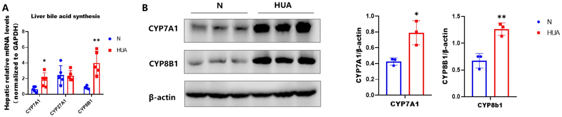Figure 5. Increased expression of CYP7A1 and CYP8B1 in HUA. (A) CYP7A1, CYP27A1, and CYP8B1 gene mRNA abundances. (B) CYP7A1 and CYP8B1 protein contents. Data are shown as means ± SDs (n = 5; unpaired Student’s t-test). *p < 0.05, **p < 0.01.