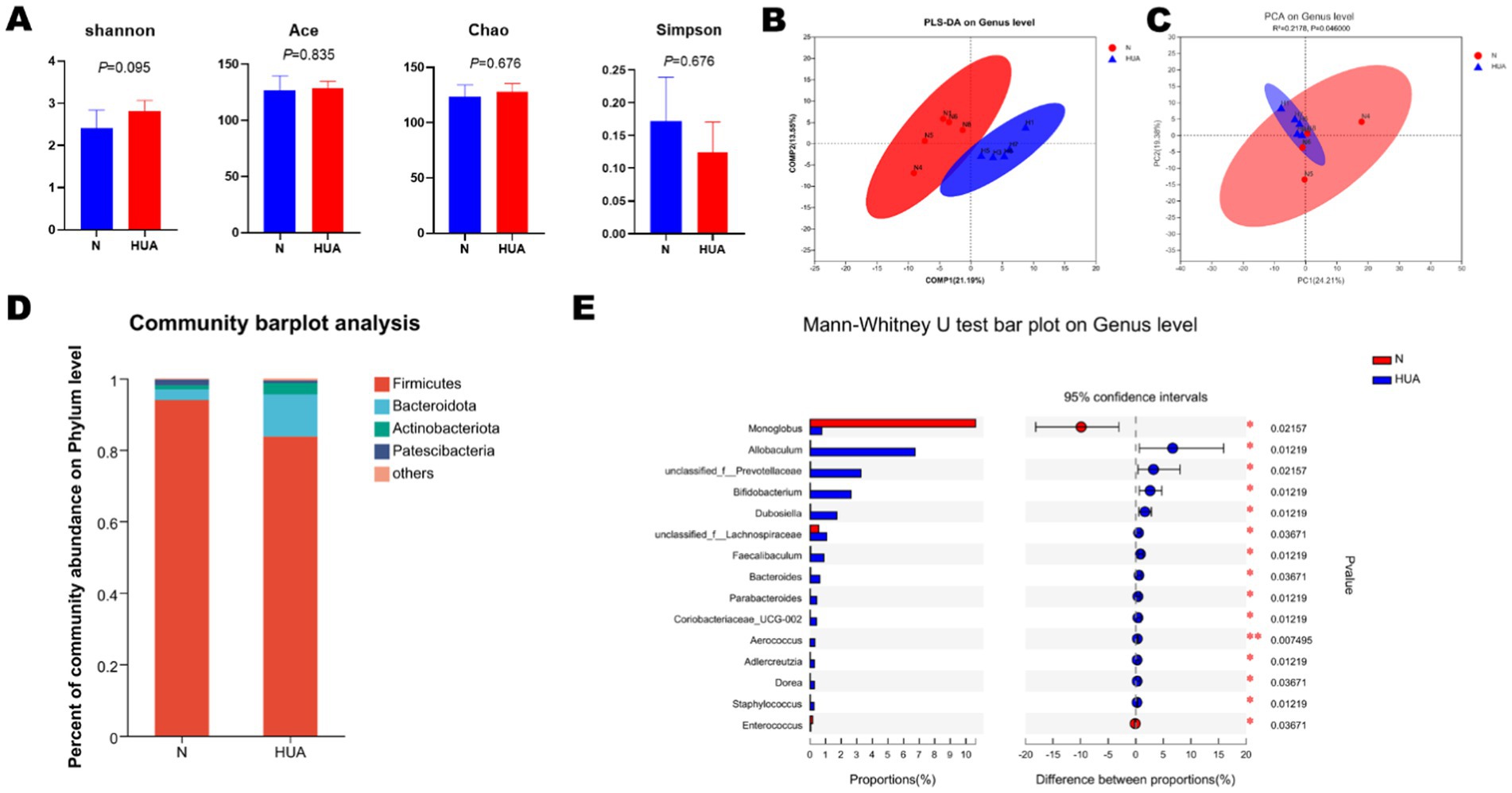 The rat fecal microbiota composition was detected by sequencing the respective 16S rDNA genes, and the gut microbiota of five rats in each group was analyzed. The Shannon, Simpson, Ace, and Chao indices were found unchanged (Figure 6A). At the genus level, we found that there was obvious separation between the groups in microbiota (Figure 6B). The bacterial communities in the HUA group and the matched controls clustered separately, suggesting that there was a remarkable difference between the N and HUA groups (Figure 6C). At the phylum level, the proportion of Bacteroidetes increased in the HUA group, and the proportion of Firmicutes decreased compared to the control (Figure 6D). There was a remarkable difference in bacterial communities among the groups. Allobaculum, unclassified_f__Prevotellaceae, Bifidobacterium, Dubosiella, unclassified_f__Lachnospiraceae, Faecalibaculum, Bacteroides, Parabacteroides, Coriobacteriaceae_UCG-002, Aerococcus, Adlercreutzia, Dorea, and Staphylococcus increased, while Monoglobus and Enterococcus decreased compared with the N group (Figure 6E).