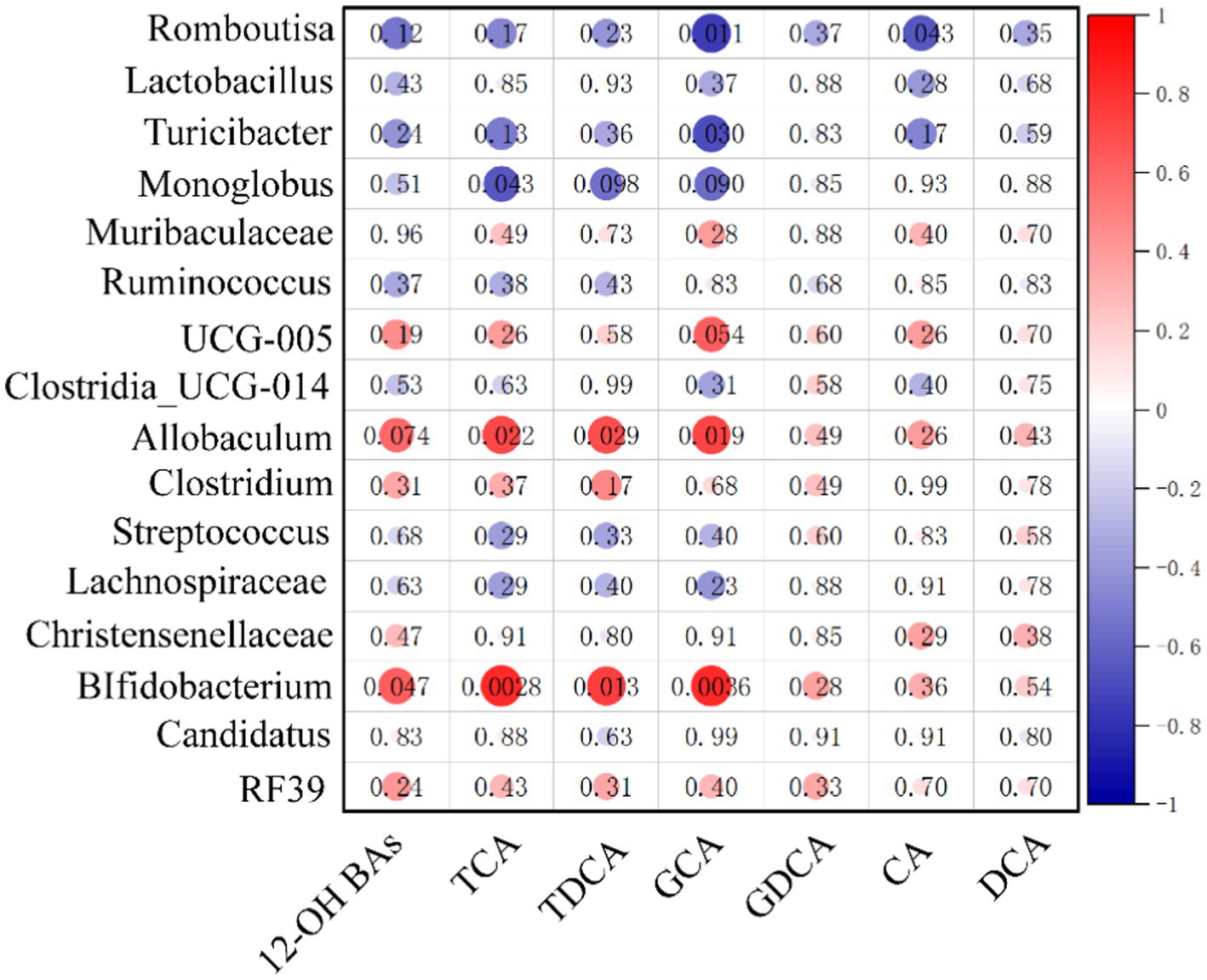 Figure 7. Heatmap of Spearman correlation coefficients between ileum contents 12α-hydroxy and microbiota. The gradient colors represent the correlation coefficients, with red being more positive and blue being more negative (n = 10, 5 samples per group). *p < 0.05, **p < 0.01.