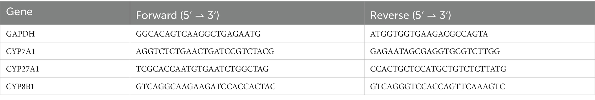 The ratio between CDCA and CA is determined by the sterol 12a-hydroxylase (CYP8B1), which is required for CA synthesis. CYP8B1 is a BA 12α-hydroxylase that determines the production of cholic acid (CA, which is 12α-hydroxylated). CA can be further modified by intestinal microbes into secondary BAs, such as DCA, TCA, TDCA, GCA, and GDCA, which are generated from CA and are 12α-hydroxylated. In our study, the expression of cytochrome P7A1 and cytochrome P8B1 induced by HUA was generally increased, while the gene expression of CYP27A1, the initiating enzyme of the alternative pathway, remained unchanged. It should be noted that the alternative pathway also involves another key enzyme, namely oxysterol 7α-hydroxylase (CYP7B1), which acts downstream of CYP27A1 to promote the synthesis of chenodeoxycholic acid (CDCA) (Wahlström et al., 2016). Although the expression of CYP7B1 was not detected in this study, the fact that the expression of the CYP27A1 gene did not change may suggest that under our experimental conditions, the alternative pathway may not be mainly activated. However, we cannot rule out the possibility that post-transcriptional regulatory or compensation mechanisms affect CYP7B1 activity. Future research, by specifically detecting the expression and activity of CYP7B1, will be of great significance for comprehensively clarifying the role of alternative pathways in the observed bile acid profile disorder in hyperuricemia.