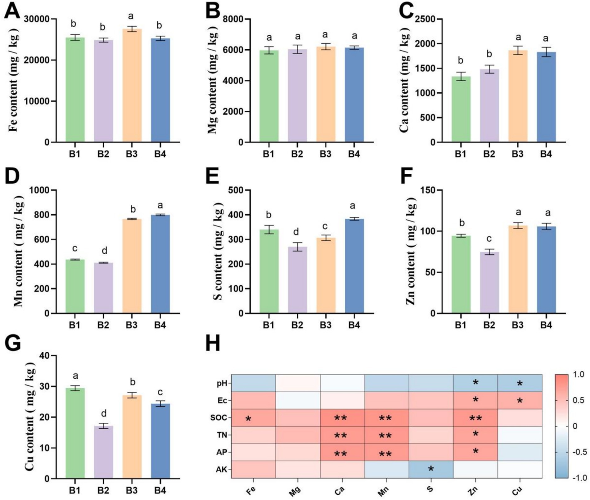 Figure 1 illustrates the dynamics of soil trace element contents. B2 had no significant effect on Fe, Mg, or Ca contents. However, under B3 and B4 treatments, Ca content increased significantly by 26 and 24%, respectively, compared to B2 (p < 0.05, Figures 1A–C). Mn, S, Zn, and Cu contents decreased after SMS application but rebounded significantly following sunflower cultivation (Figures 1D–G). Notably, in the B4 treatment, Mn, S, and Zn contents were significantly higher than in B1, with increases of 83, 13, and 12%, respectively (p < 0.05). Further correlation analysis indicated positive relationships of Ca and Zn with SOC and TN, while Cu showed a negative correlation with EC (Figure 1H). This suggests that the rotation system significantly influenced the availability of meso- and micro-elements by regulating organic matter decomposition.
