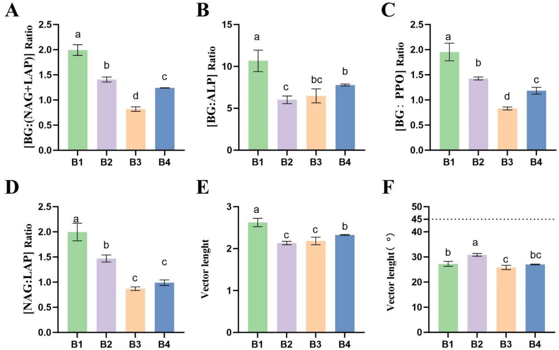 Microbial nutrient limitations were evaluated using enzyme vector analysis. Vector length indicated carbon limitation (higher values), while vector angle (A = arctan [ln(NAG+LAP)/ln(BG)]), identified nitrogen (<45°) or phosphorus (>45°) limitation. Additional ratios included: BG:(NAG + LAP) (C vs. N acquisition investment), NAG:LAP (fungal vs. bacterial N cycling dominance; >1 = fungal), BG:PPO (labile vs. recalcitrant C decomposition), and BG:ALP (C vs. P acquisition strategy).