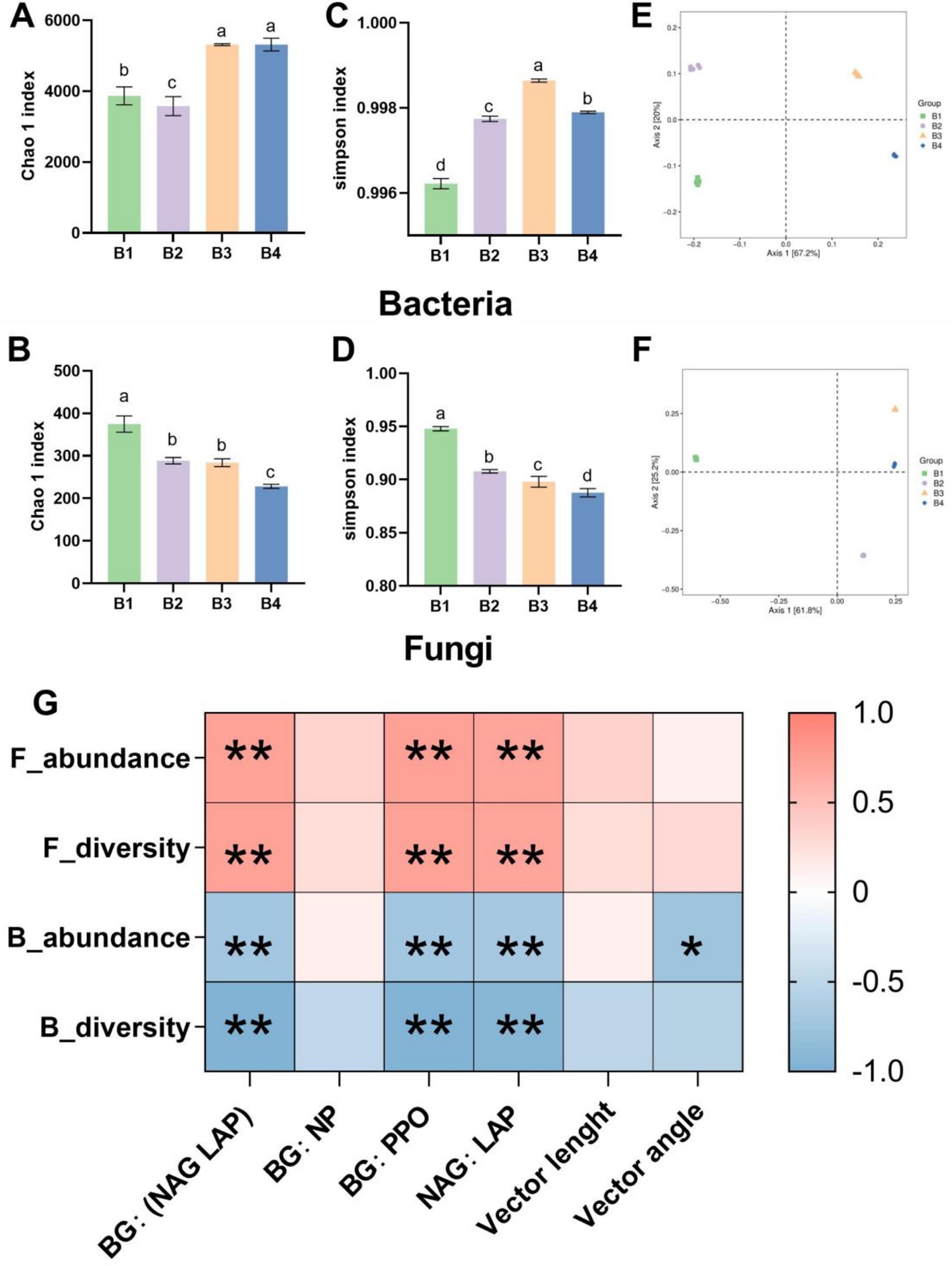Figure 3. Microbial community abundance, diversity, and enzyme activity correlations under the SR-OS2 system; (A) Bacterial Chao1 index; (B) Bacterial Simpson index; (C) Fungal Chao1 index; (D) Fungal Simpson index; (E) Principal Coordinate Analysis (PCoA) of bacterial communities; (F) PCoA of fungal communities; (G) Correlation heatmap between microbial diversity indices and enzyme activities. Different lowercase letters indicate significant differences among treatments (p < 0.05, ANOVA with LSD test). * denotes p < 0.05; F_abundance, fungal abundance; F_diversity, fungal diversity; B_abundance, bacterial abundance; B_diversity, bacterial diversity; BG, β-glucosidase; NAG, N-acetylglucosaminidase; LAP, leucine aminopeptidase; PPO, polyphenol oxidase.