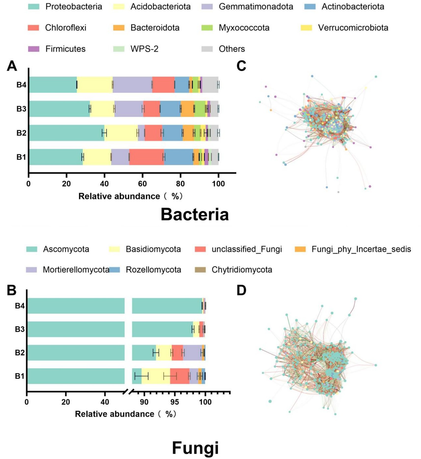 Figure 4. Phylogenetic profiling and co-occurrence network analysis of dominant bacterial and fungal phyla under the SR-OS2 system; (A) Relative abundance of top 10 bacterial phyla; (B) Relative abundance of dominant fungal phyla; (C) Co-occurrence network of top 10 bacterial phyla; (D) Co-occurrence network of dominant fungal phyla. Network edges represent significant species correlations (p < 0.05), with line thickness proportional to correlation coefficient (r). Red lines: positive correlations; Green lines: negative correlations. Node size reflects connectivity degree.