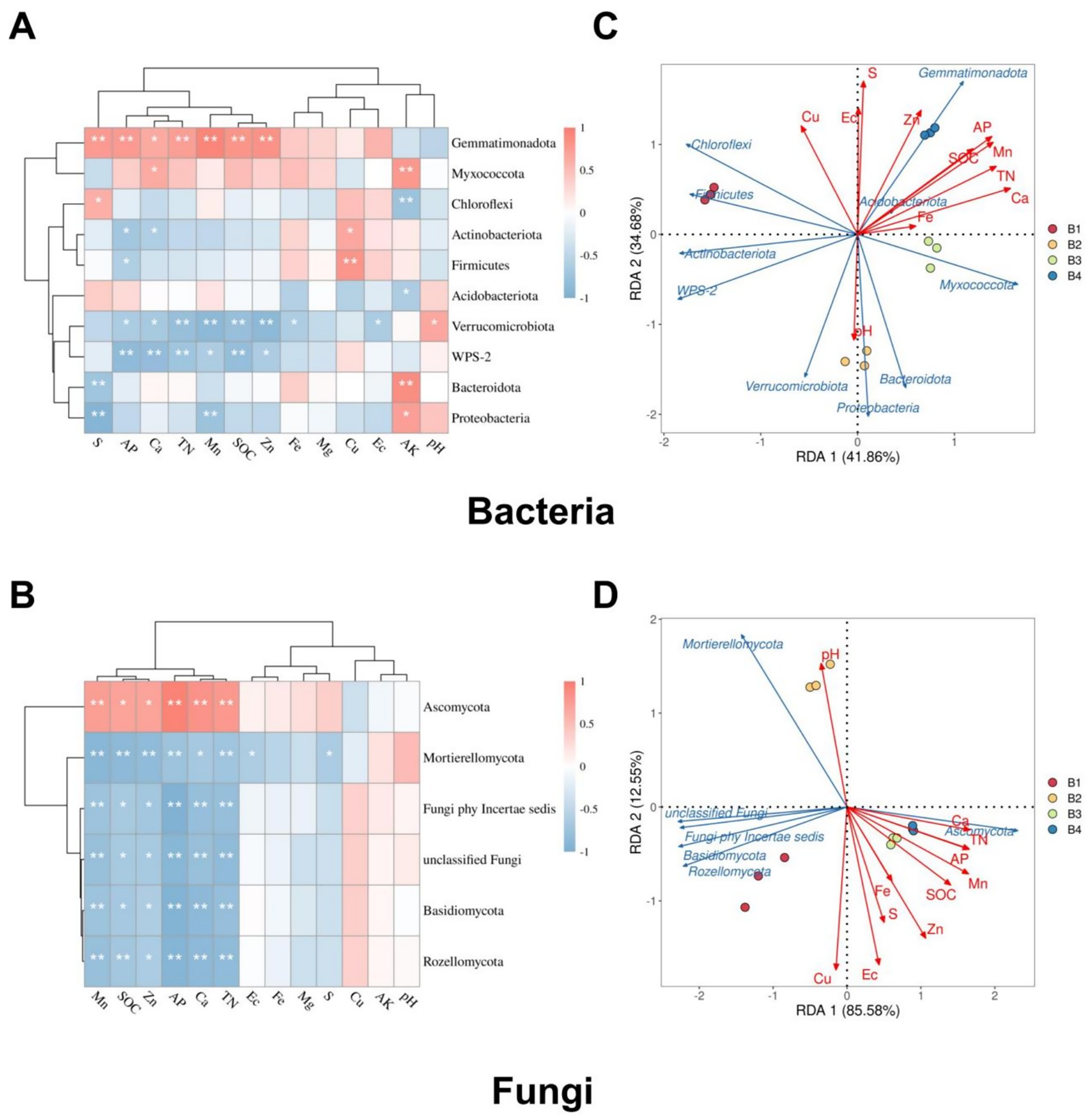RDA quantified environmental drivers of community variation. For bacteria, RDA1 and RDA2 explained 41.86 and 34.68% of abundance variation (cumulative 76.54%; Figure 5C). Actinobacteriota and Proteobacteria positively correlated with SOC, TN, and Ca, highlighting their competitiveness in organically enriched soils. Conversely, Acidobacteriota and Gemmatimonadota showed negative correlations with S, EC, Zn, AP, and Cu, indicating a preference for low-S, low-EC, and low-Zn environments. For fungi, RDA1 captured 85.58% of the variation with RDA2 explaining 12.55% (cumulative 98.13%; Figure 5D). Ascomycota and Basidiomycota are positively associated with TN and Ca, dominating high-N/high-Ca soils. Mortierellomycota are closely linked with SOC, iron (Fe), and Mn, while unclassified fungi and Rozellomycota were negatively regulated by S, Zn, EC, Cu, and AP, indicating competitiveness in low-S, low-Zn, low-EC, low-Cu, and low-P environments.